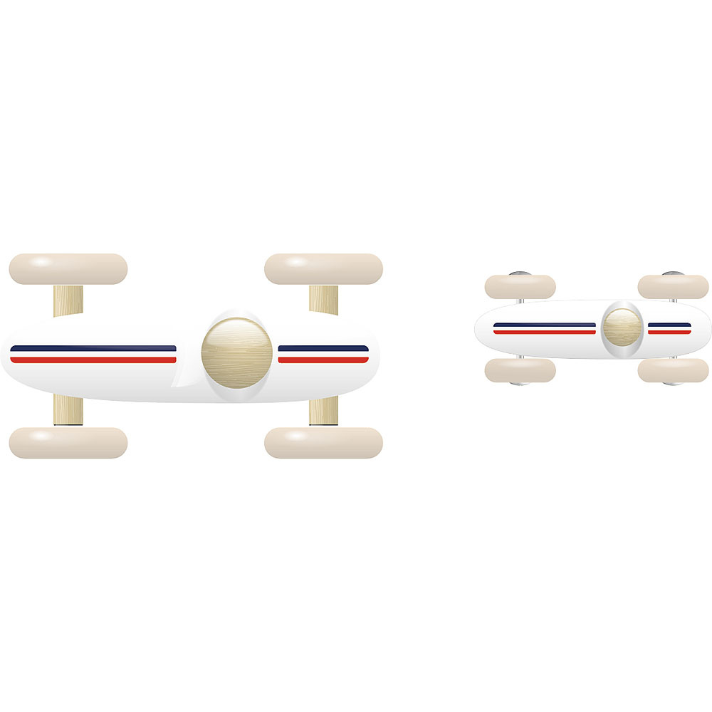 Model bílého vintage auta ze závodu Grand Prix. Vyrobeno z lakovaného dřeva ve Francii. Má velká bílá gumová kola, která zajišťují tichý chod na všech podlahách.
