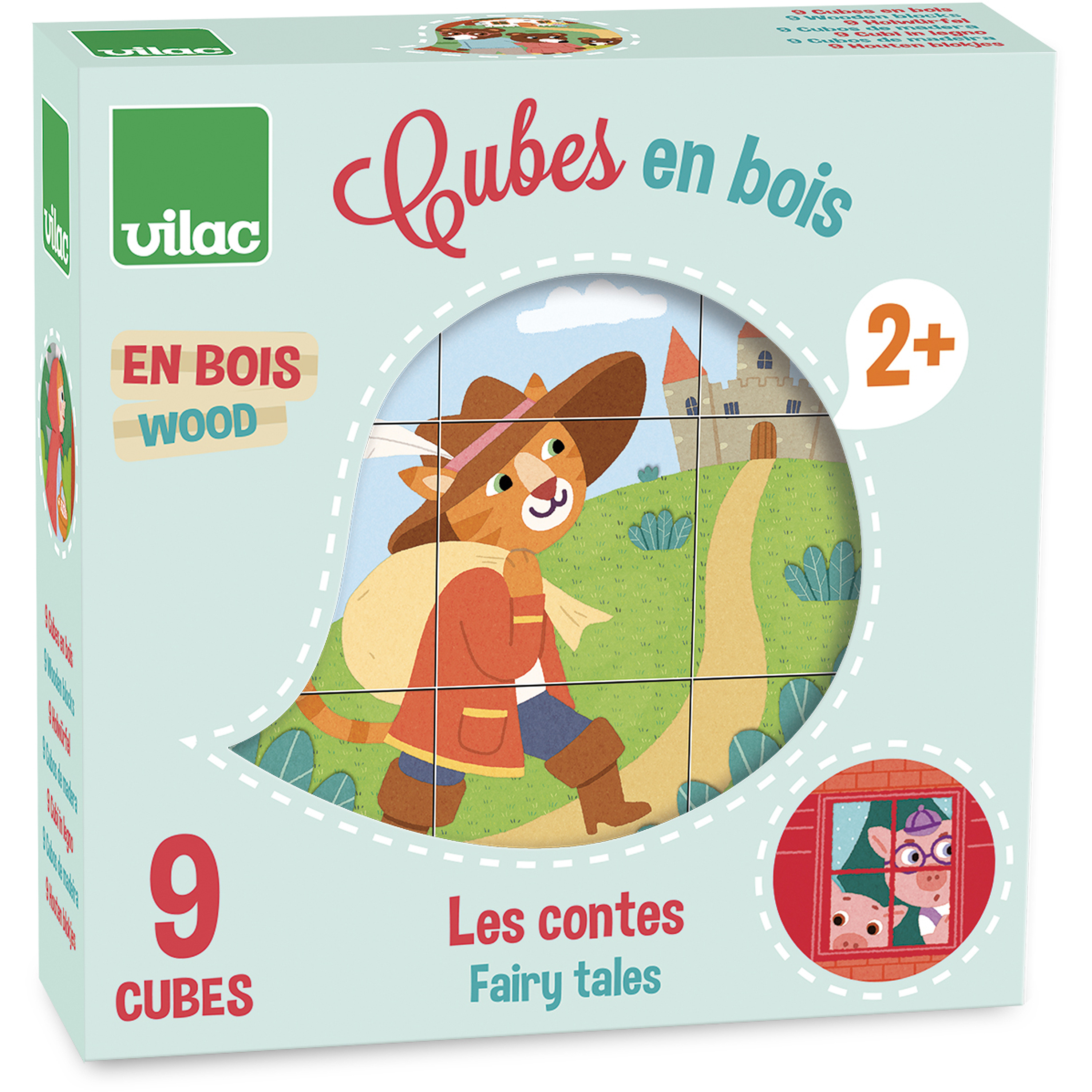 Devět dřevěných kostek s ilustracemi, z kterých je možno postavit šest velkých obrázků z dětských pohádek – Malá mořská víla, Kocour v botách, Perníková chaloupka...