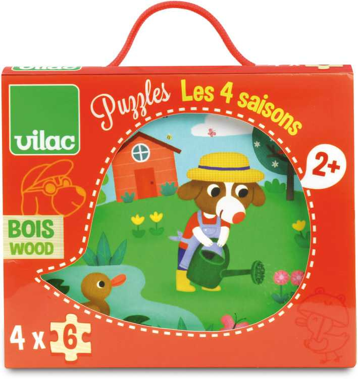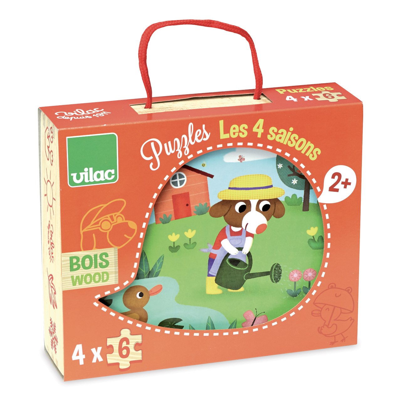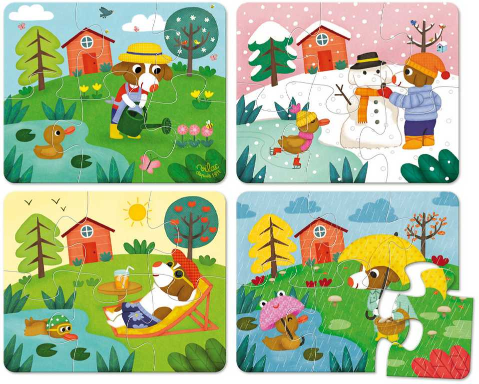 Čtvery dřevěná puzzle o šesti dílcích s tematikou čtyř ročních období. Zabaleno v pěkném dřevěném boxu s bavlněnou rukojetí.