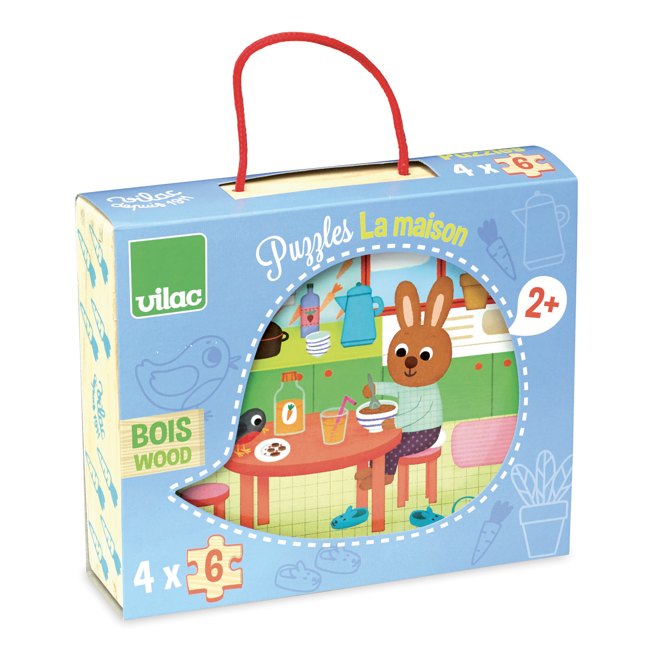 Dřevěné puzzle o šesti dílcích s tematikou domácnosti. Čtyři různé obrázky. Zabaleno v pěkném dřevěném boxu s bavlněnou rukojetí.