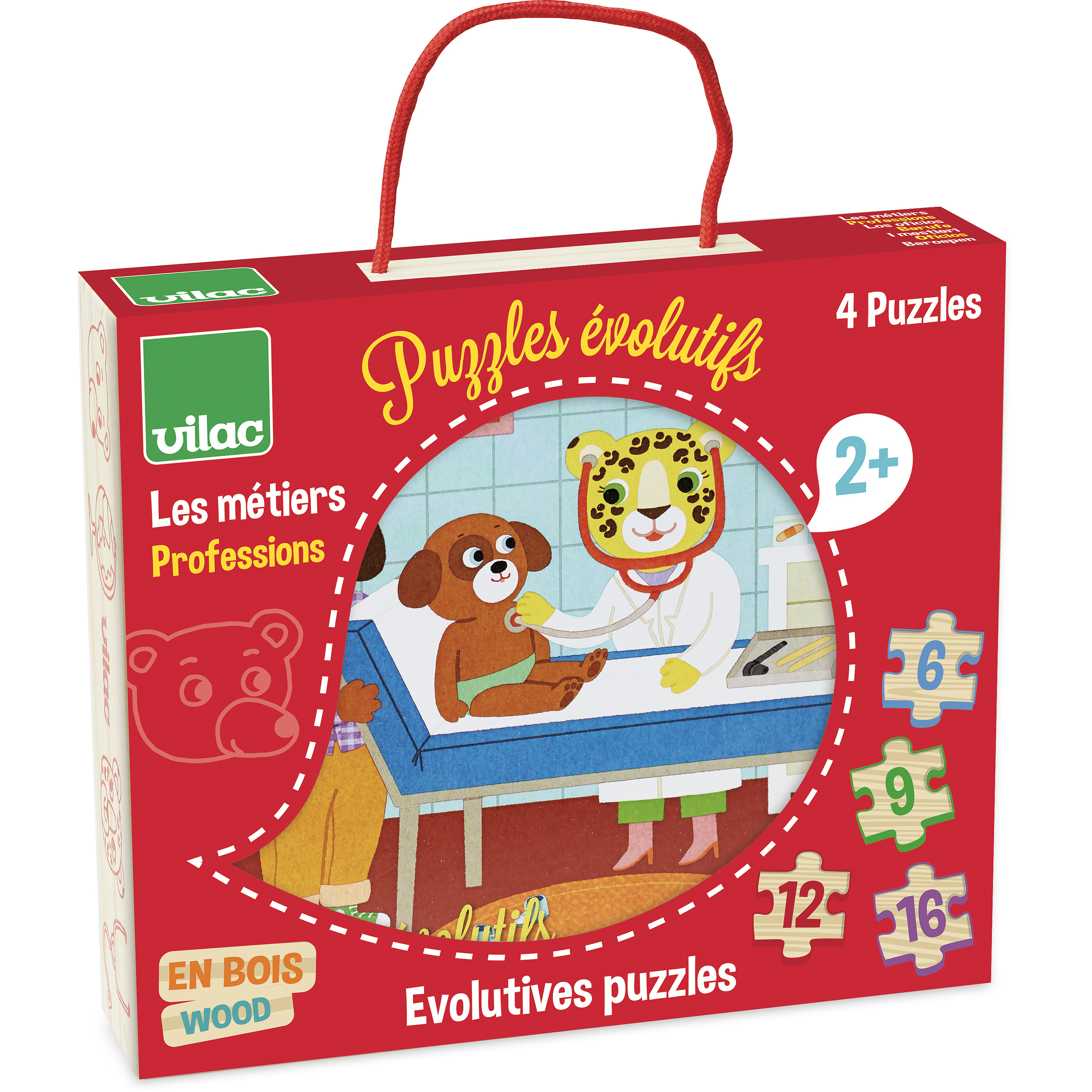 Sada čtyř vývojových puzzlí s tematikou povolání. Puzzle mají zvyšující se obtížnost – 6, 9, 12 a 16 dílků. Zabaleno v boxu s bavlněnou rukojetí.