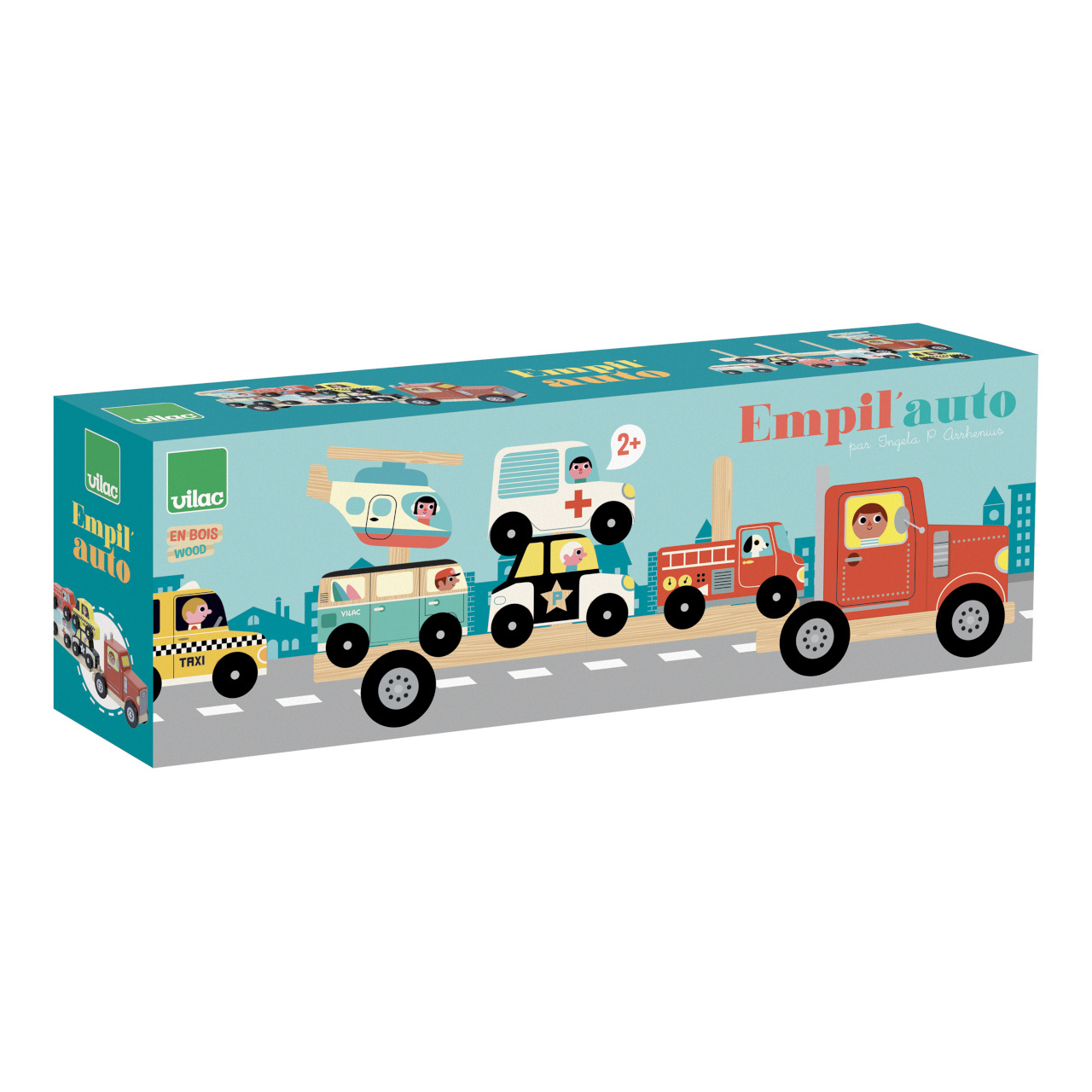 Netradiční pojízdná nasazovačka! Dřevěná nasazovací hračka ve formě kamionu s dlouhým přívěsem. Můžete na něj nasadit 6 dopravních prostředků – taxi, policejní auto, hasičské auto, sanitní vůz, helikoptéru a minibus. Ilustrováno Ingelou P. Arrhenius. Vhodné od 2 let.