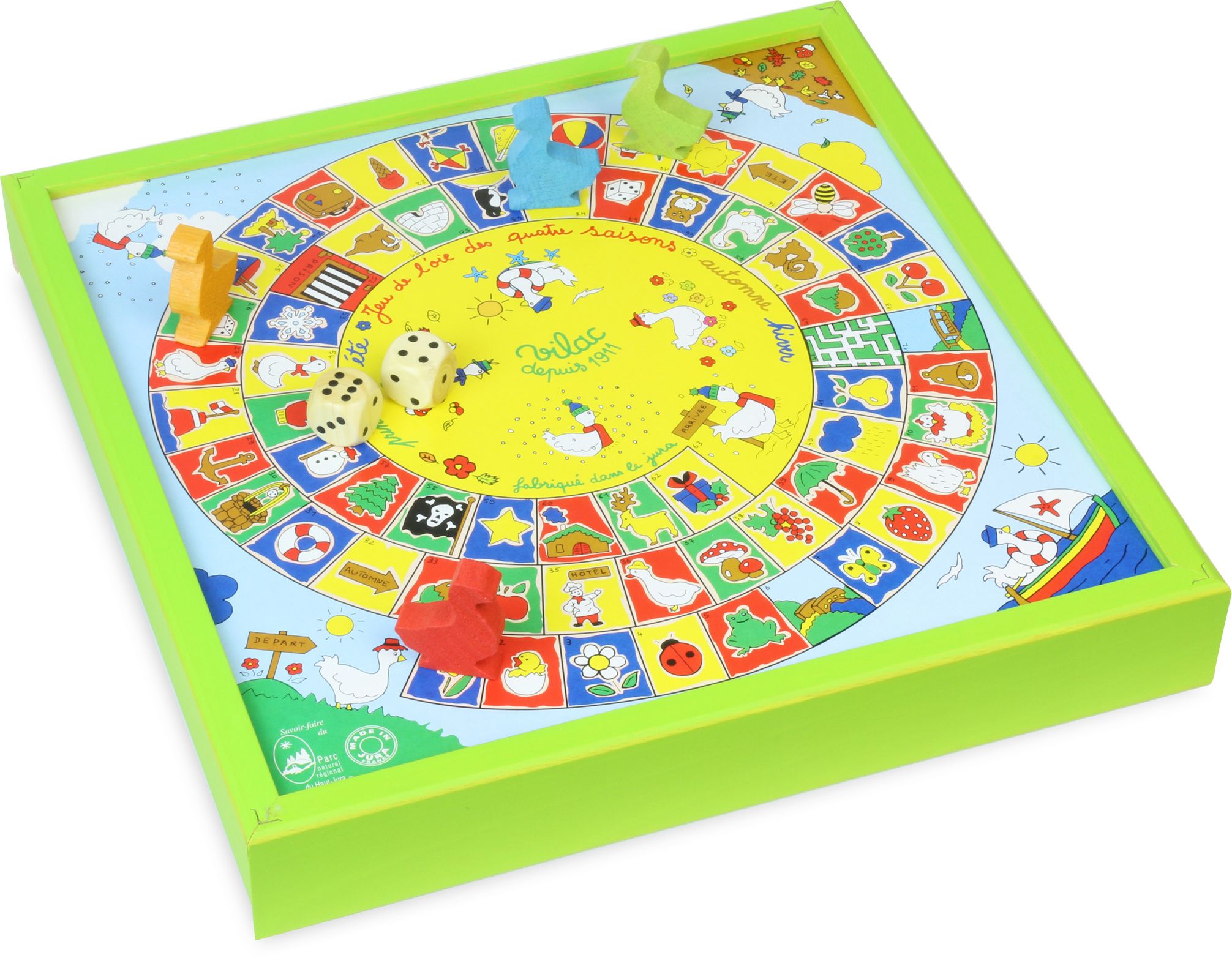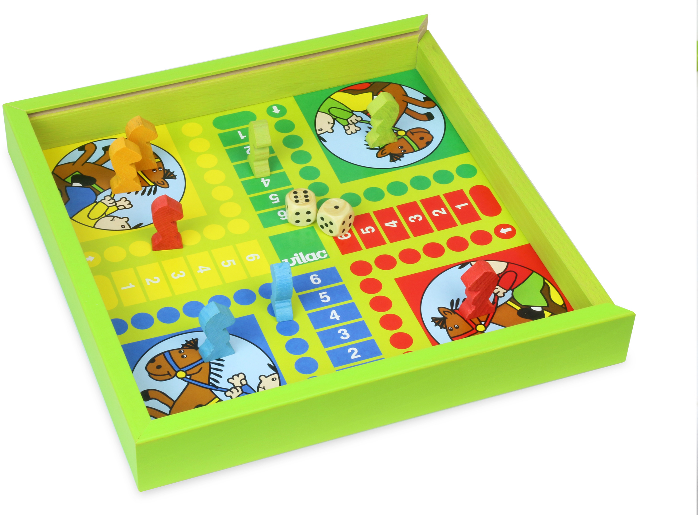Klasický dřevěný soubor her. Na jedné straně najdete Člověče nezlob s figurkami koní, na druhé Husí hru. Husí hra spočívá v tom, že se dva nebo tři hráči pohybují po spirálovitém hracím poli a snaží se vyhnout políčkům s nástrahami jako například „most“ nebo „hotel“. Zábavné hry pro malé i velké. Vyrobeno ve Francii.
