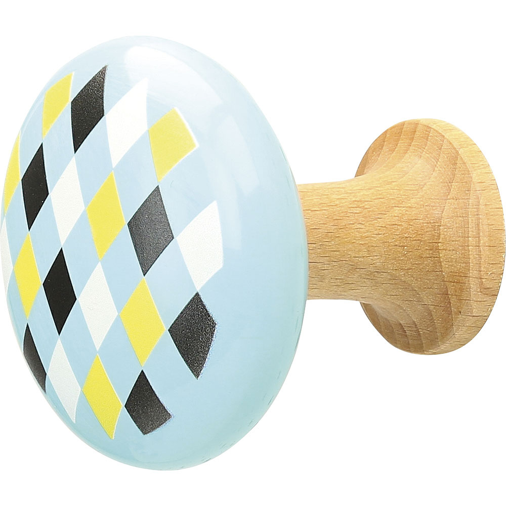 Set dřevěných věšáčků, jeden s ilustrací sovy, druhý s barevnými kosodélníky. Navrženo Ingelou P. Arrhenius. Vyrobeno z lakovaného dřeva ve Francii.