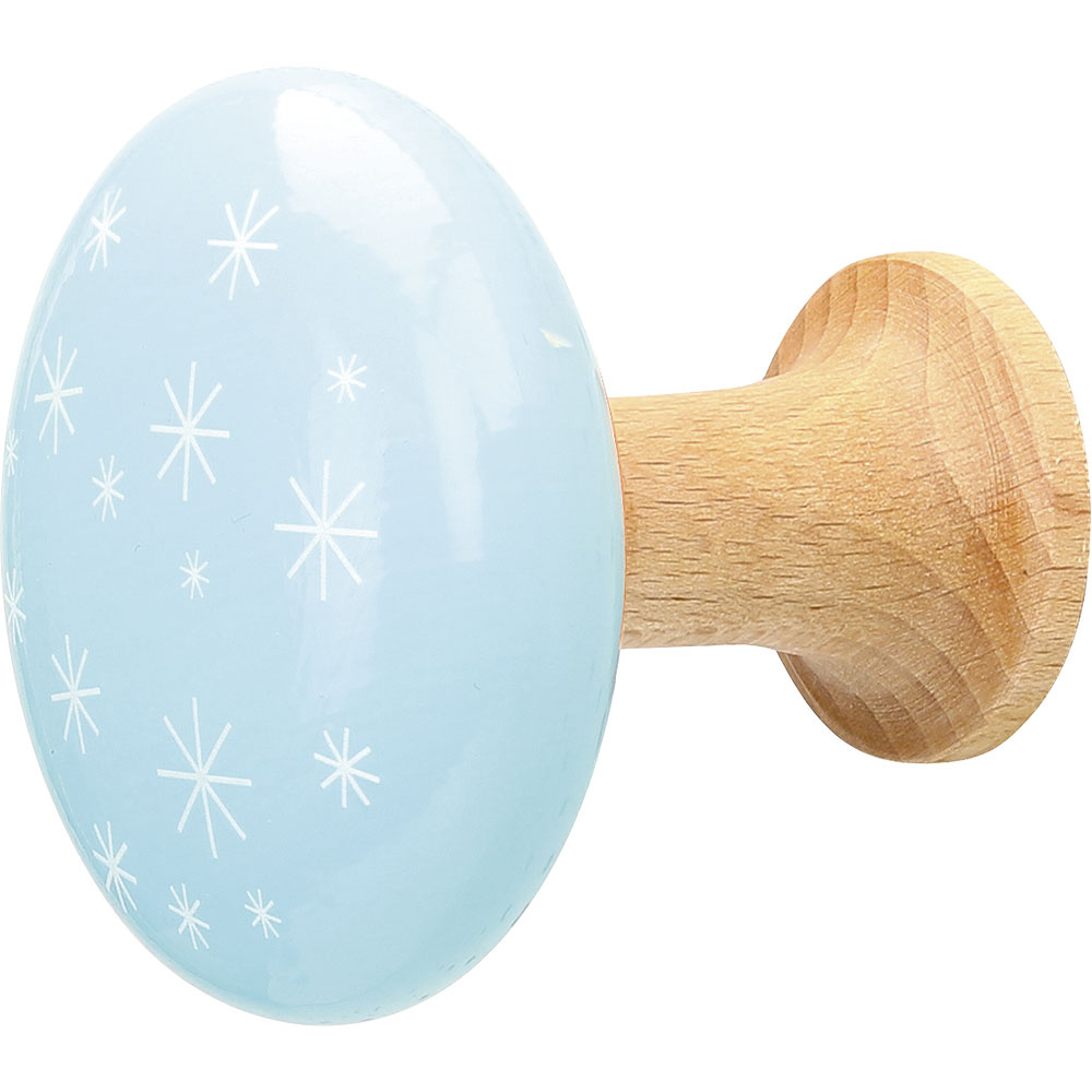 Set dřevěných věšáčků, jeden s ilustrací lachtana, druhý modrý s vločkami. Navrženo Ingelou P. Arrhenius. Vyrobeno z lakovaného dřeva ve Francii.