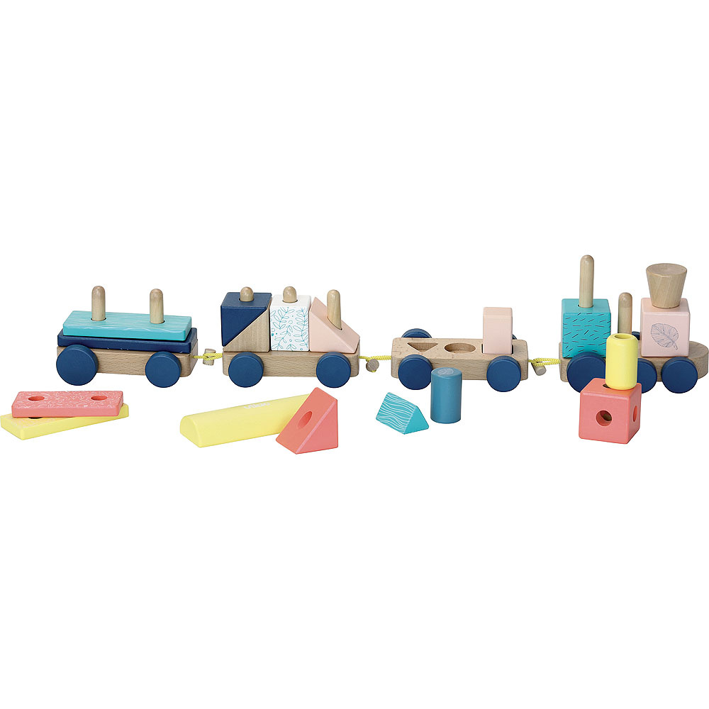 Dřevěná multifunkční hračka, vláček, na který můžete skládat kostky. Kostky mají různé velikosti, tvary a barvy. Mašinka a vagónky jsou spojeny textilními poutky s dřevěnou kuličkou. Vláček je pojízdný. Vhodné od 18 měsíců.