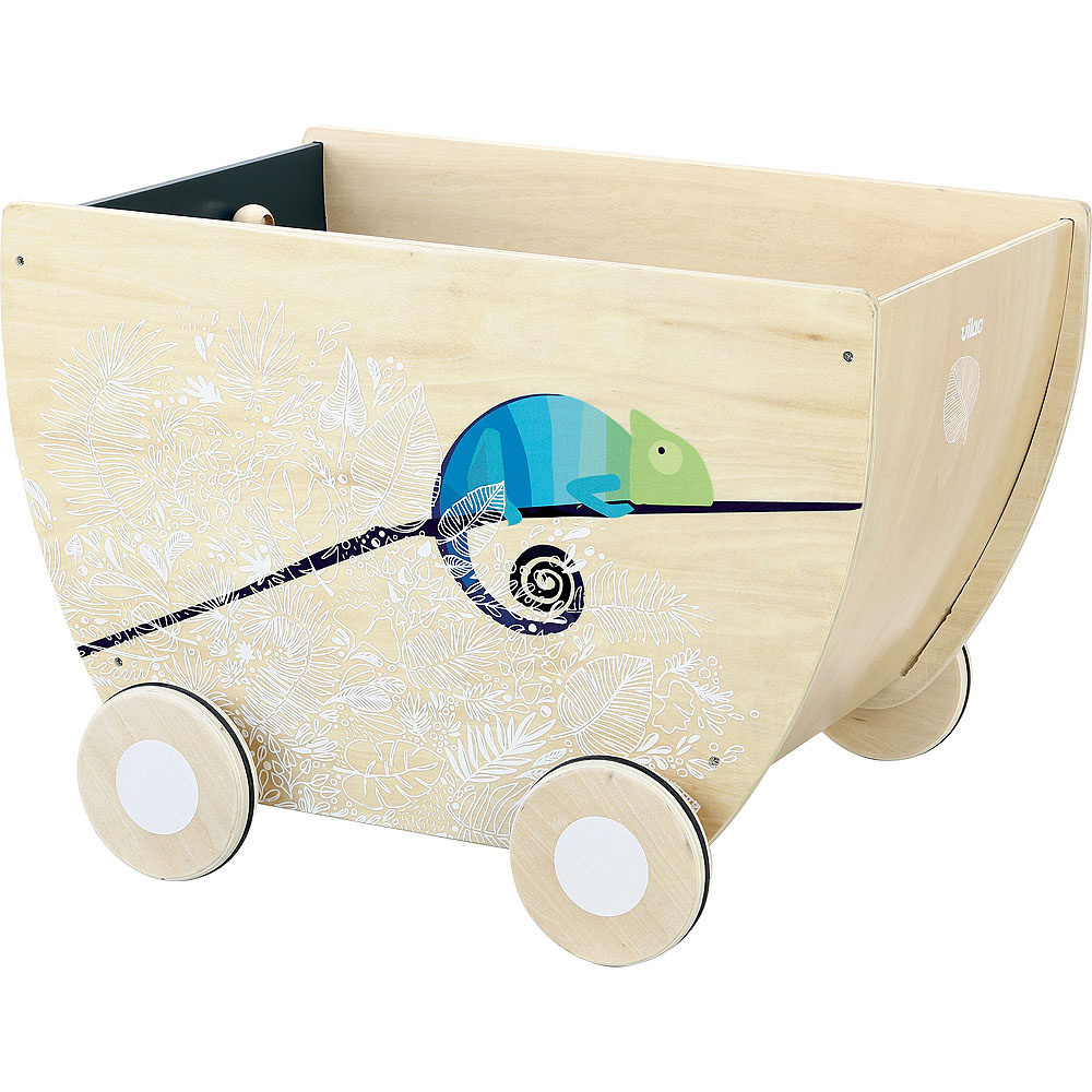 Krásný dřevěný vozík s pogumovanými kolečky. Je vyroben z barevného a přírodního dřeva, přírodní části mají bílé zdobení a barevnou ilustraci pandy a chameleona. Je ideální pro uložení dětských hraček. Vemte prosím na vědomí, že tento vozík nebyl navržen tak, aby unesl váhu dítěte.