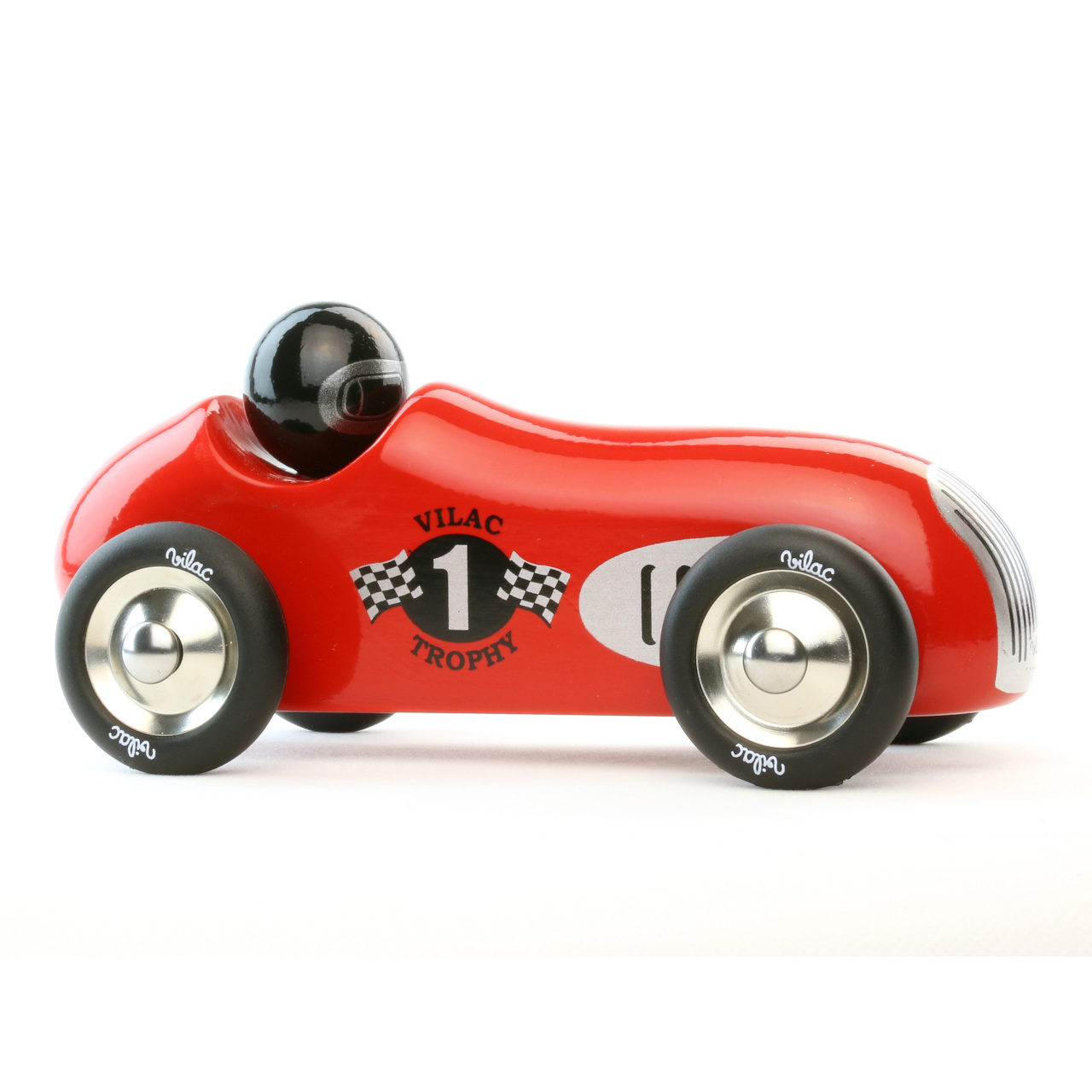 Červené vintage závodní auto vyrobeno z lakovaného dřeva s kovovými pogumovanými koly. Je vhodné jak ke hraní tak jako dekorace do pokojů dětí či dospělých. Vyrobeno ve Francii.