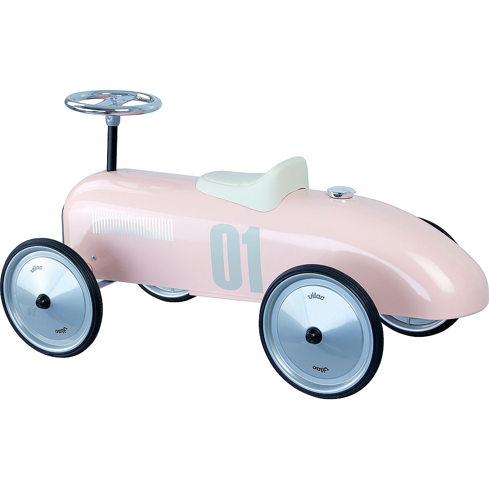 Odrážedlo Vintage ve stylu závodního auta je plně kovové a má růžovou metalickou barvu. Volant ovládá zatáčení předních kol. Bílé sedadlo je vyrobeno z plastu. Kola odrážedla jsou pogumovaná a zaručují tak tichý chod i na pevném povrchu.