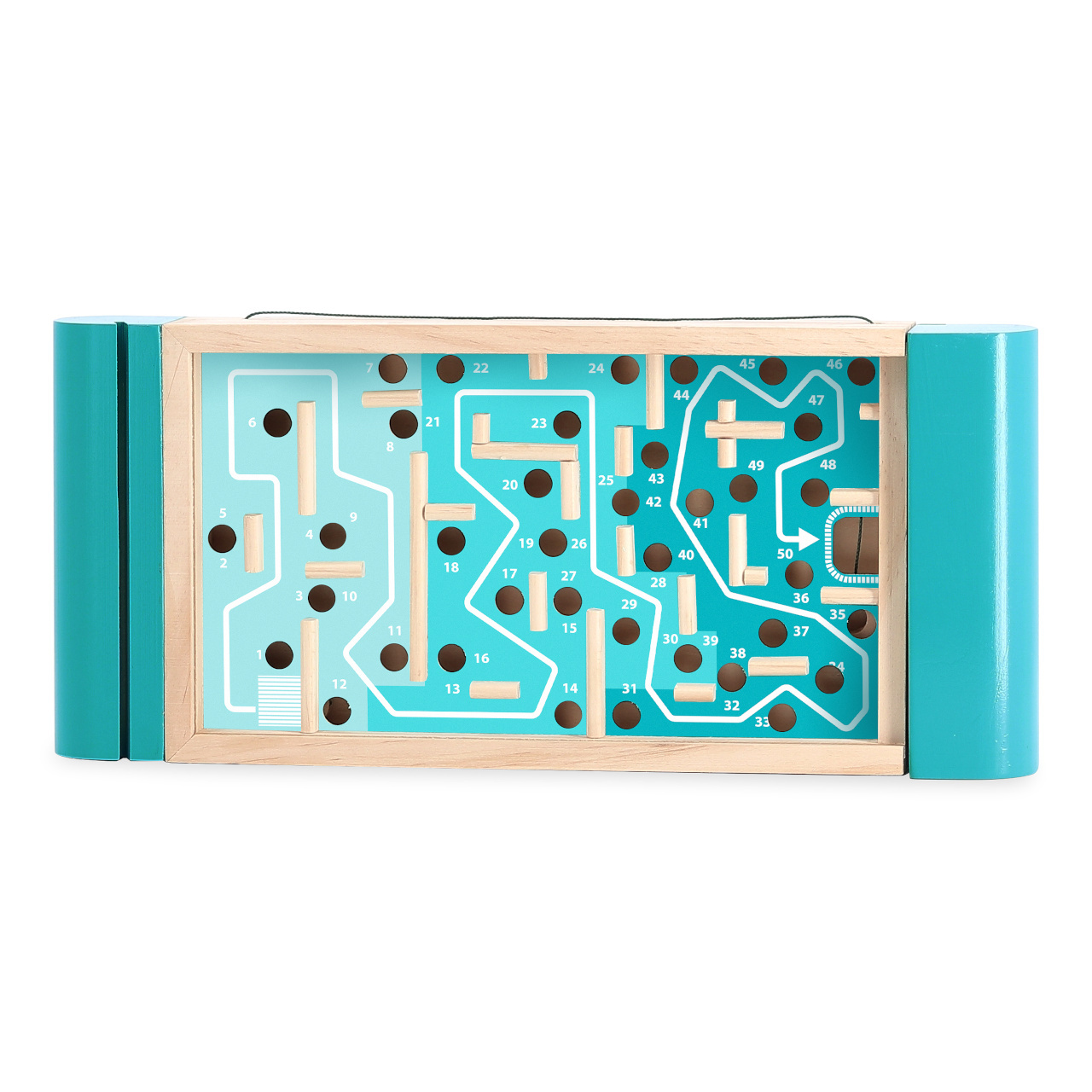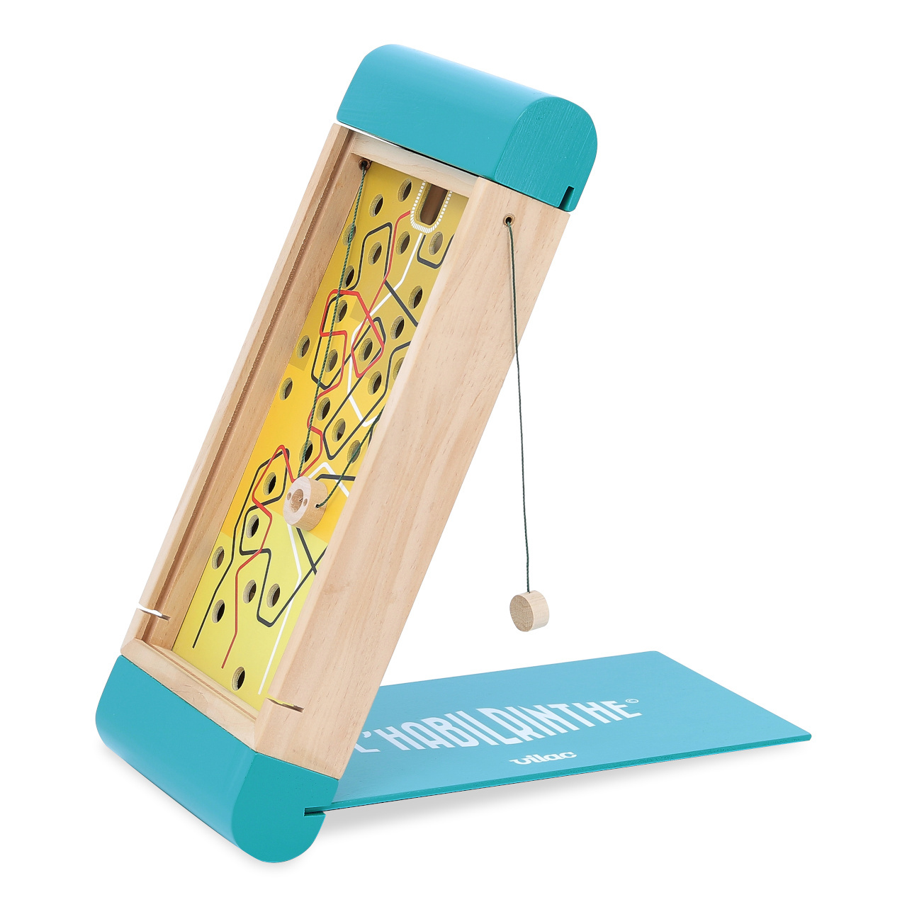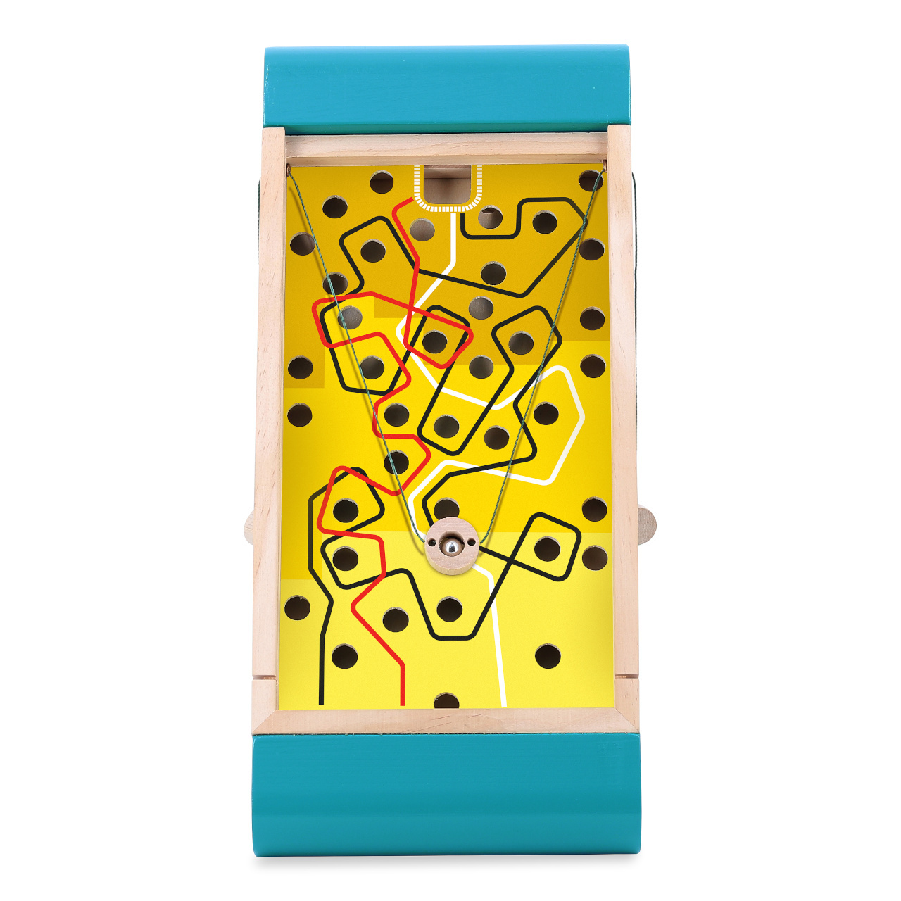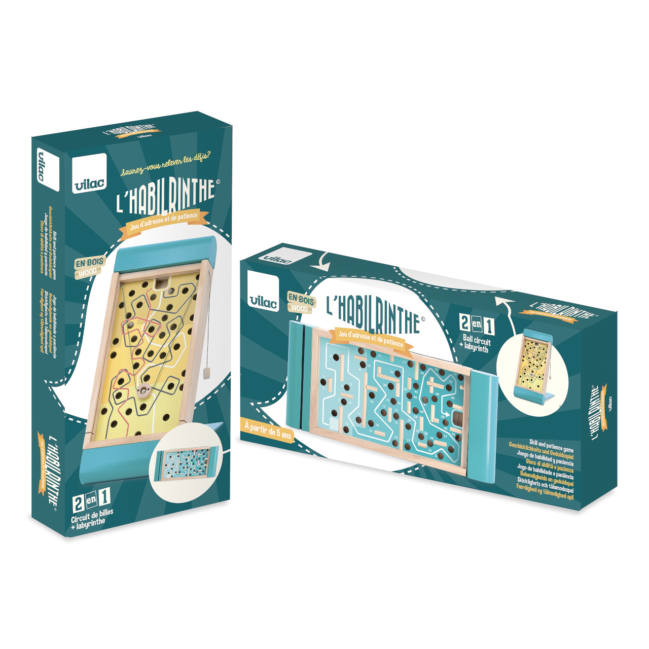 Proveďte neposednou kuličku cestami plnými nástrah v podobě propadlišť. Labyrint Vám přináší zábavu, která důkladně prověří Vaši šikovnost a trpělivost, a to rovnou ve dvou variantách! Na jedné straně pohyb kuličky ovládejte táhly a vyberte si přitom jednu z trojice barevně vyvedených tras s různou obtížností. Na opačné straně směřování kuličky ovlivňujte pouhým náklonem labyrintu. Hračka je velmi kompaktní, opatřená praktickým víkem, které díky promyšlené konstrukci využijete i jako oporu při hře. Je vyrobena z pečlivě opracovaného a atraktivně lakovaného dřeva.