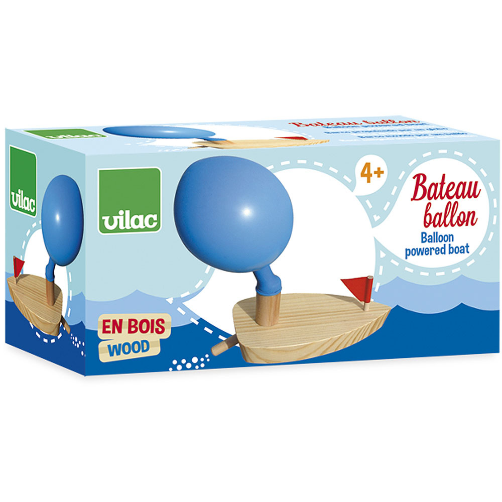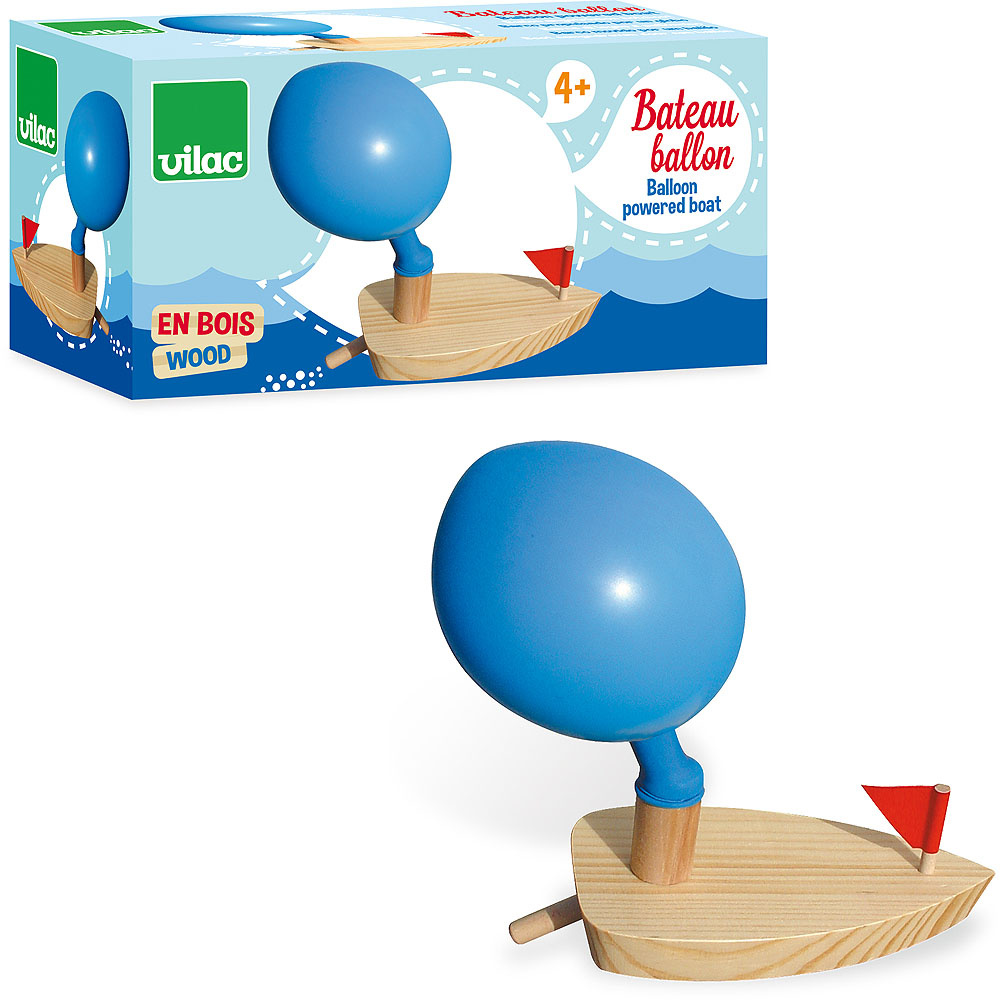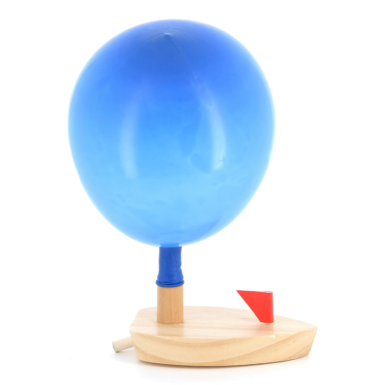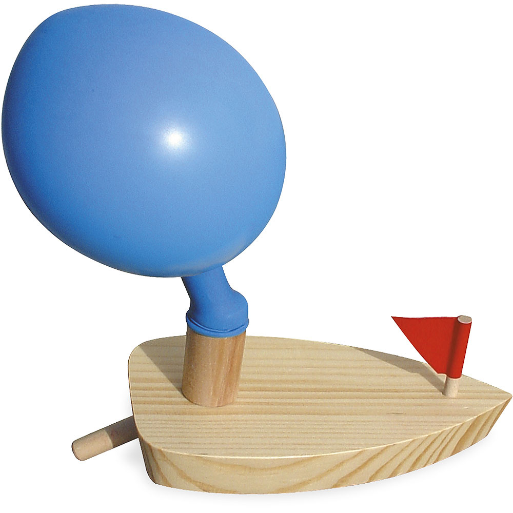 Při vypouštění vzduchu z balónku se dřevěná loďka pohybuje vpřed.