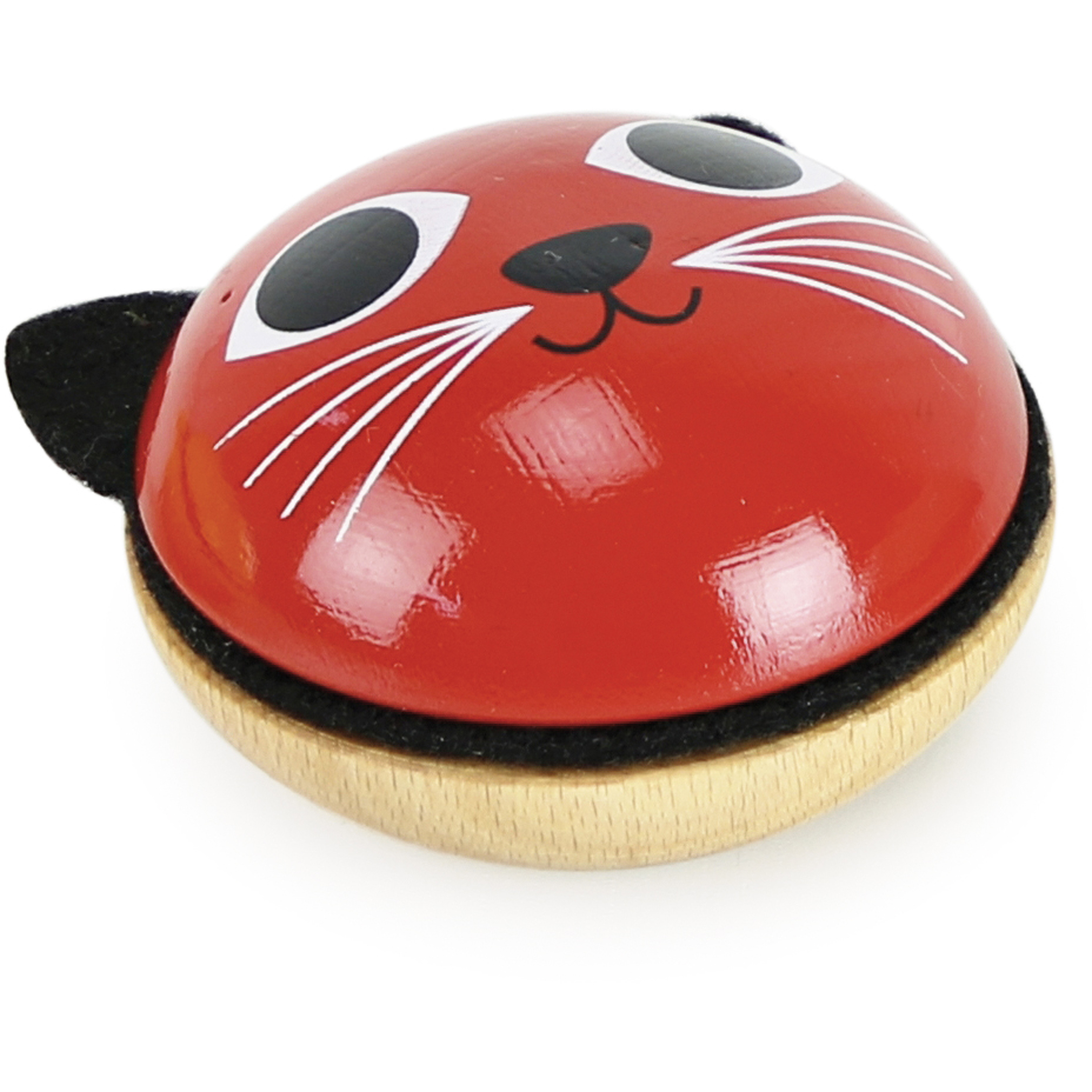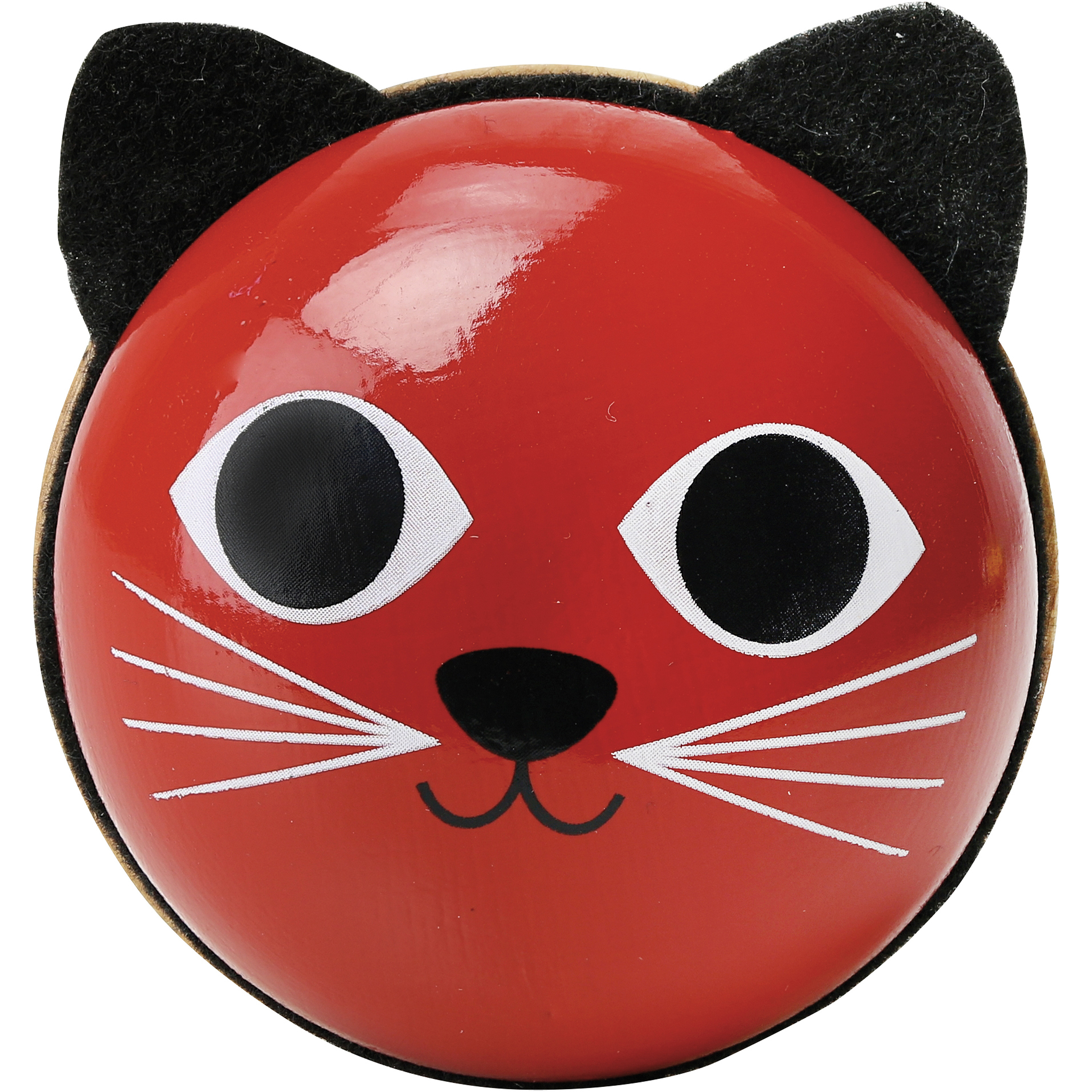 Pěkná červená kočka jako chrastítko – rumba koule. Ilustrace Ingela P. Arrhenius. Vyrobeno ze dřeva a plstě ve Francii. Průměr 8 cm.