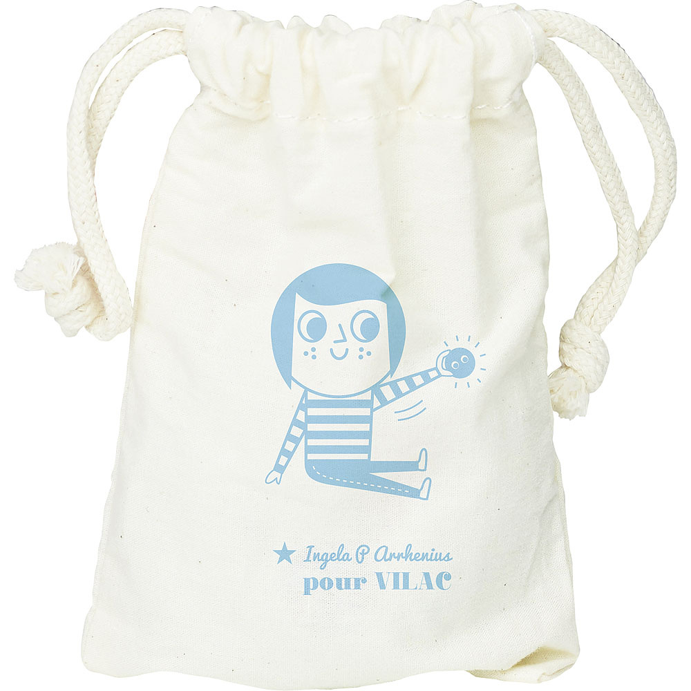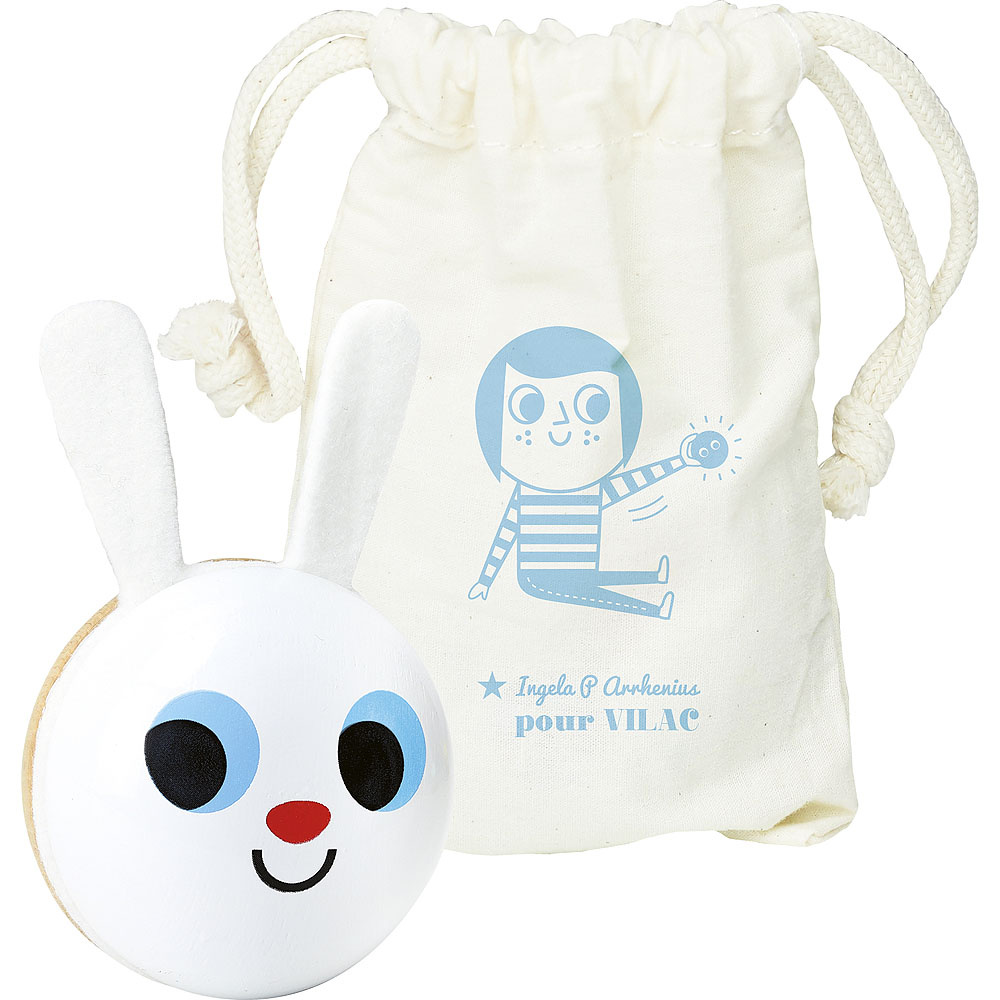 Pěkný zajíček jako chrastítko – rumba koule. Ilustrace Ingela P. Arrhenius. Vyrobeno ze dřeva a plstě ve Francii. Průměr 8 cm.