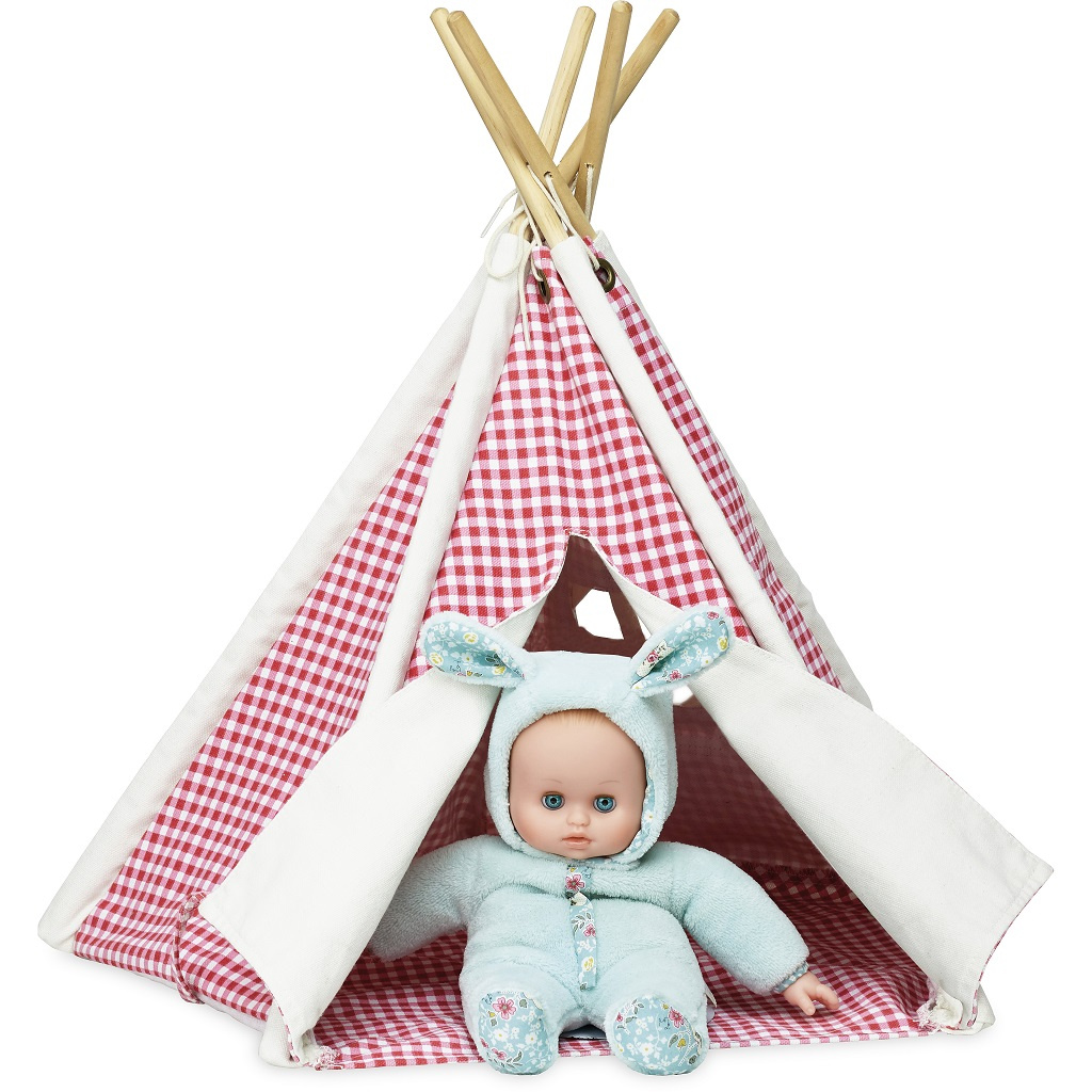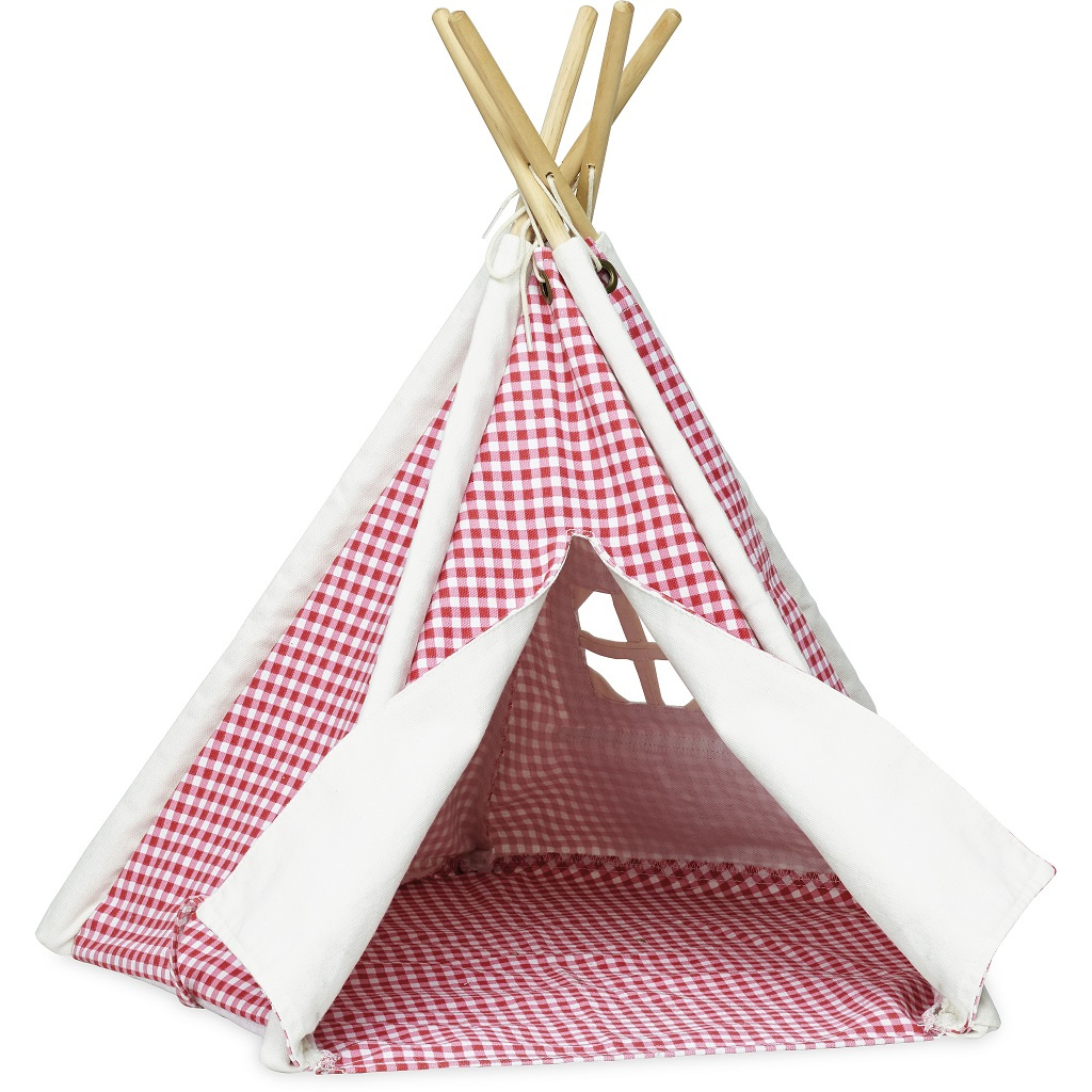 Krásné kárované týpí v mini provedení, ideální pro panenky. Dřevěný základ s textilním přehozem je jednoduché složit. Textil je červeno-bílý.