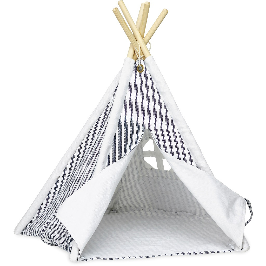 Krásné pruhované týpí v mini provedení, ideální pro panenky. Dřevěný základ s textilním přehozem je jednoduché složit. Textil je tmavě šedý a bílý.