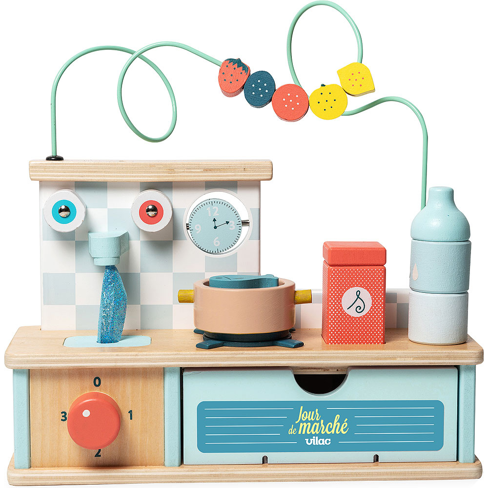 Tato dřevěná multifunkční motorická kuchyň je určena pro ty nejmenší a nabízí spoustu překvapení a rozmanitých aktivit! Labyrint s ovocem, otáčecí hodiny, stohovatelnou láhev a solničku. Umístěte ryby do hrnce a uvařte je jako dospělí. Poté otevřete dvířka trouby, abyste do trouby umístili koláče, otočením knoflíku začněte péct. Hmmm, voní to tak dobře! Pokud chcete umýt nádobí, stačí otevřít kohoutky. Tato motorická kuchyňka byla navržena týmem specialistů firmy Vilac pro smyslový rozvoj dětí.