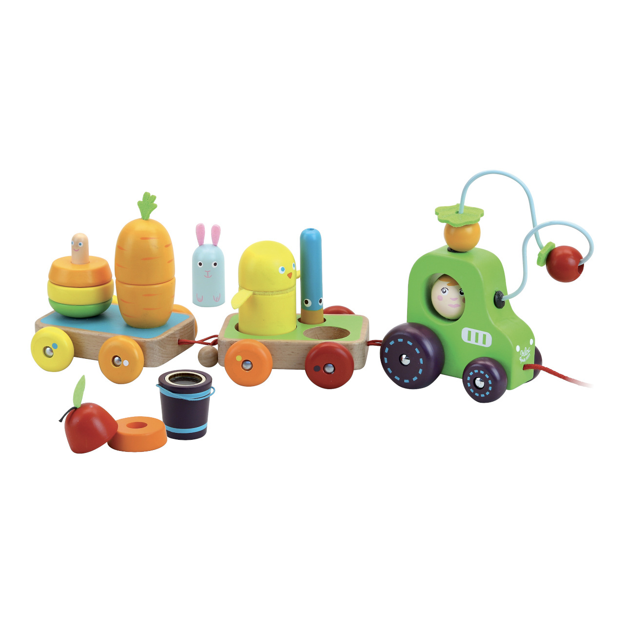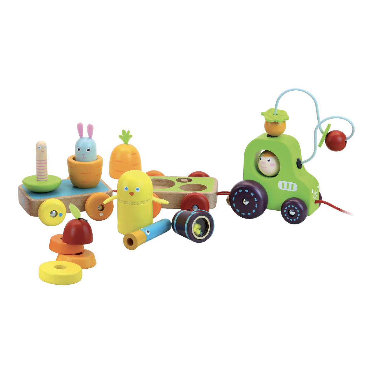 Skládací hruška ukrývá červíka, králík je schovaný v mrkvi, ptáčci pípají, kbelík s kukuřicí štěrká jako rumba koule a traktor má posuvné korálky na drátku ve tvaru ovoce. Hračka, která rozvine představivost, motoriku a zvídavost Vašich dětí.