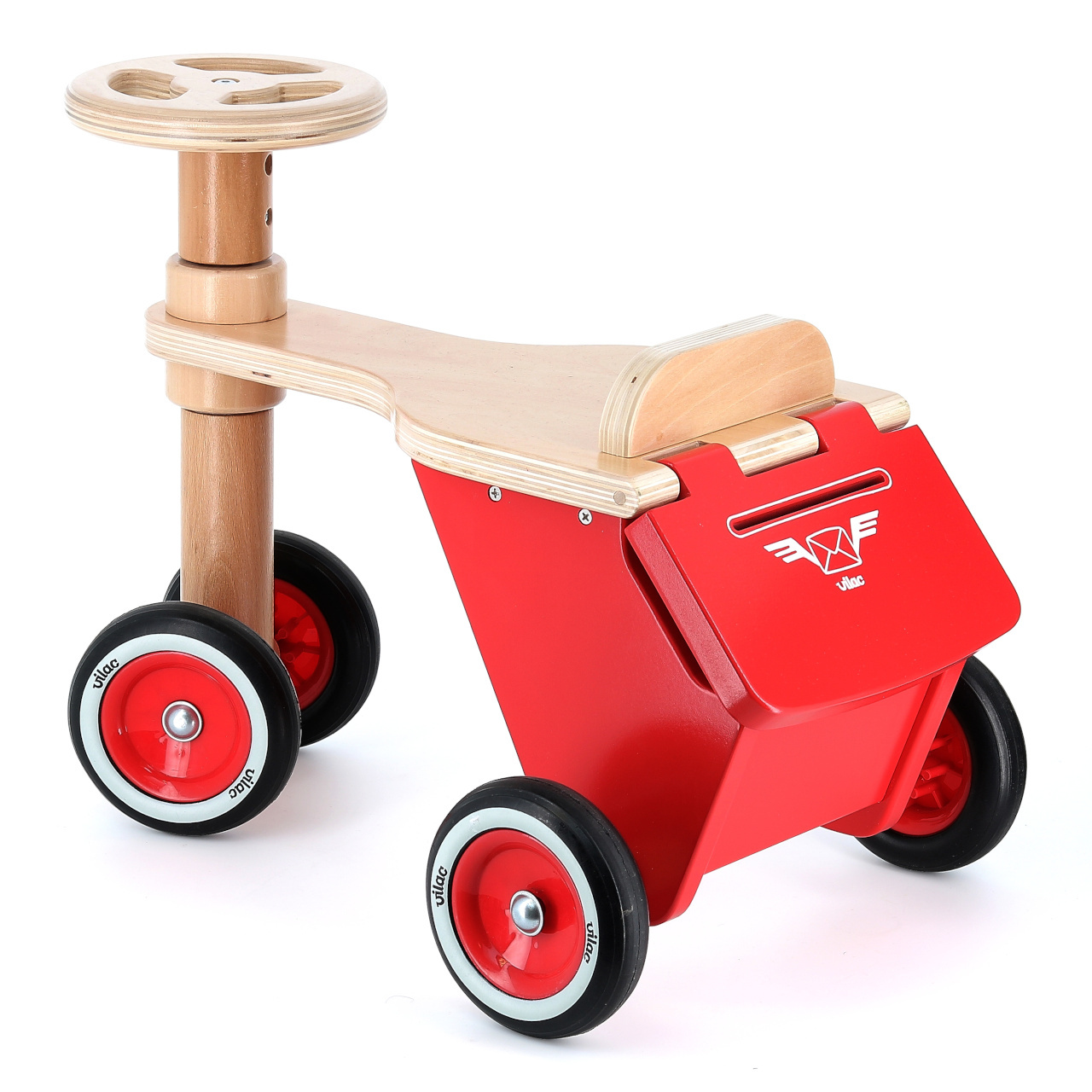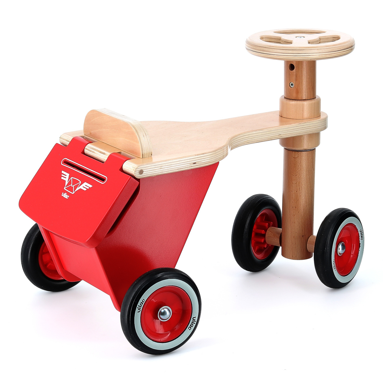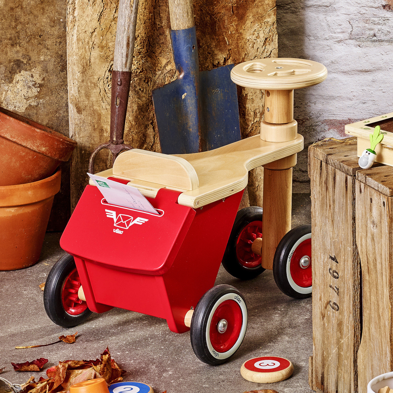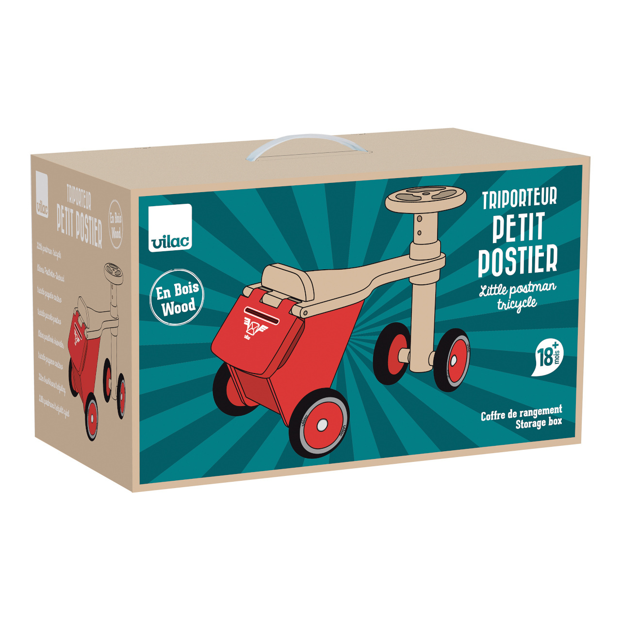 Každý listonoš bude tiše závidět! Atraktivní a propracované odrážedlo je v zadní části vybaveno kufříkem s odklopným víkem a štěrbinou, kam lze vhazovat například první malůvky. Nabízí ovšem dostatek prostoru, aby mohli nejmenší na cestu s sebou vzít i oblíbené plyšové zvířátko. Vozítko vyniká výjimečně robustní konstrukcí využívající silnou překližku i díly z masivního dřeva. Úhel otáčení jeho volantu je omezen tak, aby byla zaručena stabilita a nehrozil pád dítěte. Plastová kola jsou opatřena odolnými pneumatikami, které tlumí hluk a zároveň zlepšují jízdní vlastnosti. Bezpečnost odrážedla byla i laboratorně ověřena, Vaši nejmenší tak mohou bez obav vyrazit za dobrodružstvím. Výrobek vyžaduje montáž, dodáváno s obrázkovým návodem k sestavení.