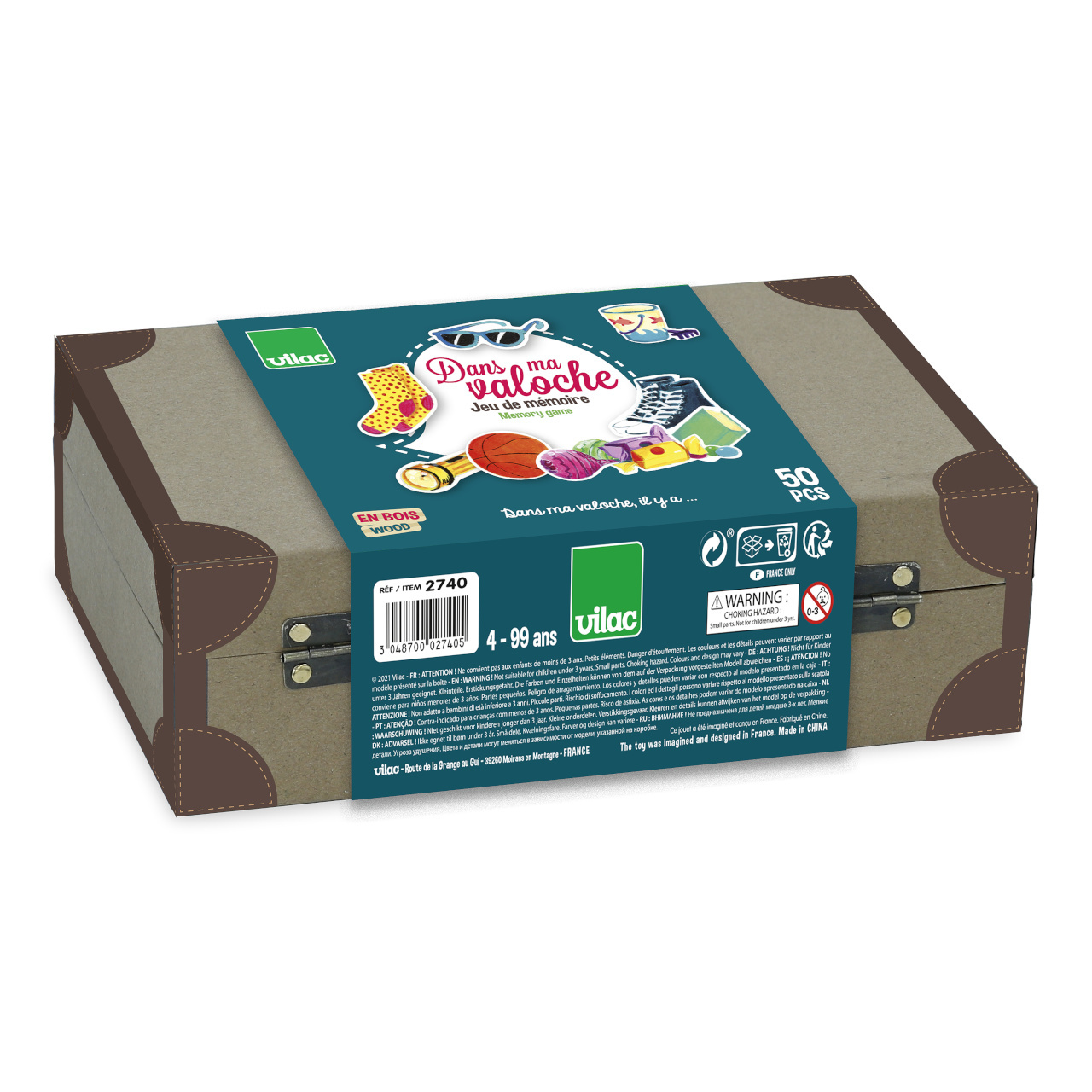 Vilac verze známé hry „Do mého kufru jsem vložil/a…“. Hráči si musí zapamatovat předměty, které postupně vloží do kufru, tato hra netrénuje pouze paměť, ale také hmat. Nezapomeňte ani na jeden předmět, malí cestovatelé, jinak budete ze hry vyřazeni! V balení 1 kartonový kufřík a 50 dřevěných dílků v textilním pytlíku.