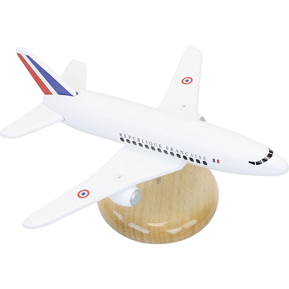 Model oficiálního letadla prezidenta Francie. Tato sběratelská dřevěná hračka je dodávána se stojanem. Vyrobeno ve Francii.