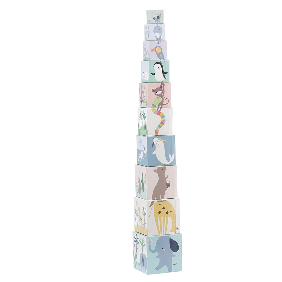 10 ks kartonových skládacích kostek s krásnými ilustracemi od designérky Sarah Betz. Děti od 2 let se při hraní naučí jak skládat kostky, tak rozpoznávat zvířata, barvy a také počítat. Kostky naskládané na sebe, od největší po nejmenší, tvoří věž o výšce přibližně 87 cm. Rozvíjí koordinaci ruka-oko, a tím celkovou zručnost dětí. Vyžaduje vizuální pozornost a schopnost koncentrace.