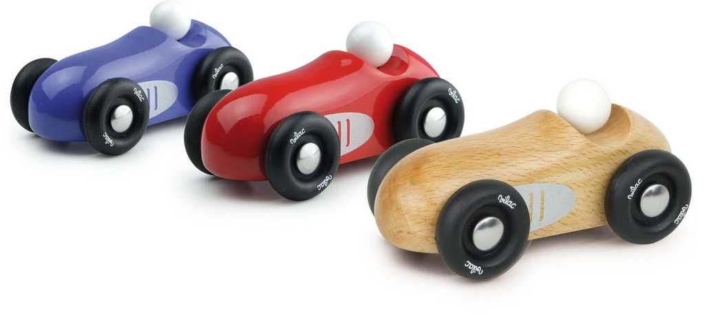 Závodní auto vyrobeno z lakovaného dřeva v červené barvě, s masivními gumovými koly. Je vhodné jak ke hraní tak jako dekorace do pokojů dětí či dospělých. Vyrobeno ve Francii.