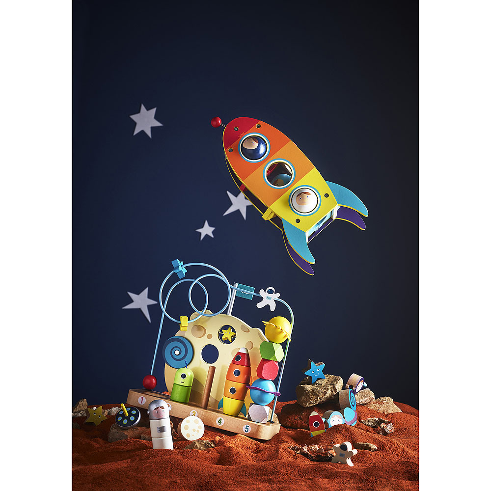 Krásná provlékačka v motivu vesmíru. V kompaktním balení najdete 14 ilustrovaných dřevěných korálků (např. astronaut, měsíc, slunce, raketa), které děti mohou navlékat na textilní šňůrku. Hračka pomáhá s rozvojem jemné motoriky. Vybaveno bezpečnostními sponami. Vhodné od 18 měsíců.