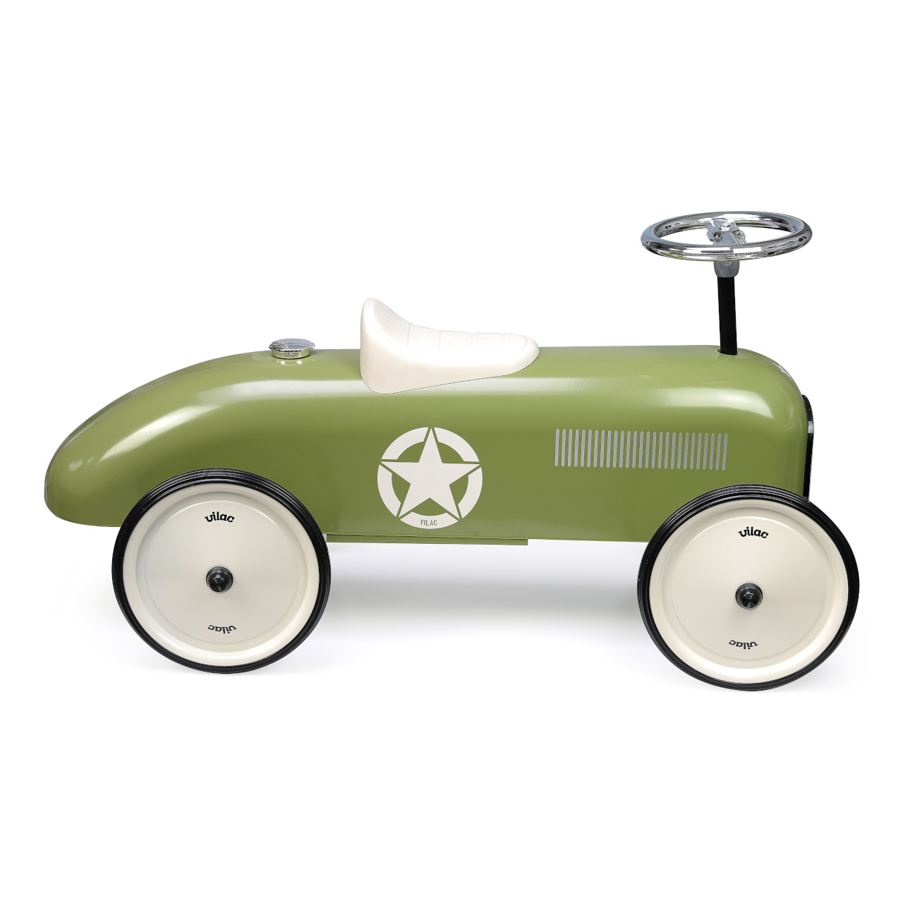 Přeneste se do 30. let a nechejte se unést ladnými aerodynamickými tvary i barevností jedinečného odrážedla Vilac z kolekce Vintage. Svým vytříbeným designem se stane ozdobou dětského pokoje. Odolná kovová karoserie je zdobená nepostradatelnými detaily čelní masky a víka nádrže. Polohu pevného, ale pohodlného plastového sedadla lze v případě potřeby upravit. Velký volant umožňuje snadné a přesné ovládání. Pogumovaná kola zabezpečují tichý, kultivovaný chod na všech typech povrchů a nekloužou, čímž vnáší do jízdy potřebnou jistotu a oporu nejmenším jezdcům. Ti se tak mohou bezpečněji pohybovat a lépe koordinovat své pohyby.