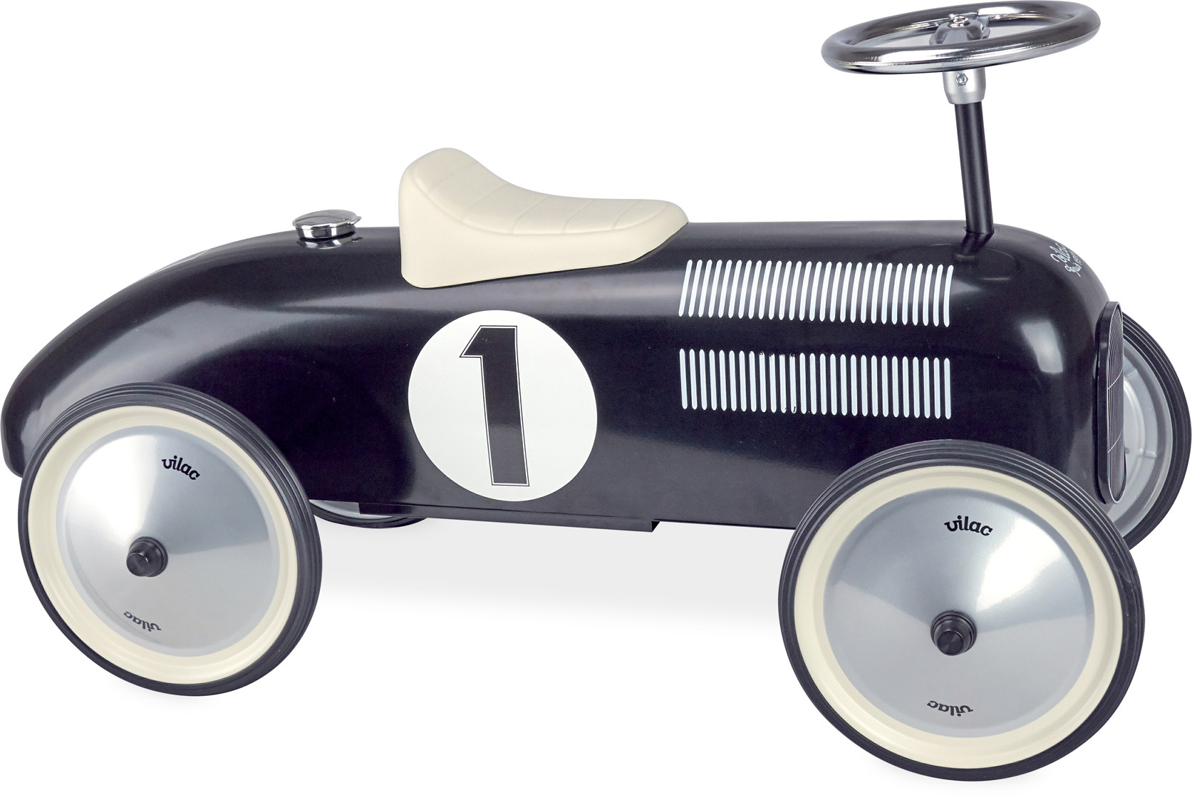 Odrážedlo Vintage ve stylu závodního auta je plně kovové a má černou metalickou barvu. Volant ovládá zatáčení předních kol. Bílé sedadlo je vyrobeno z plastu. Kola odrážedla jsou pogumovaná a zaručují tak tichý chod i na pevném povrchu.