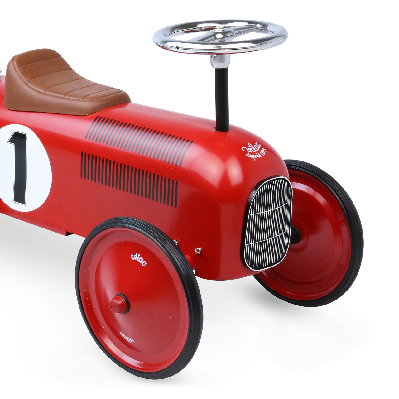 Odrážedlo Vintage ve stylu závodního auta je plně kovové a má červenou metalickou barvu. Volant ovládá zatáčení předních kol. Hnědé sedadlo je vyrobeno z plastu. Kola odrážedla jsou pogumovaná a zaručují tak tichý chod i na pevném povrchu.