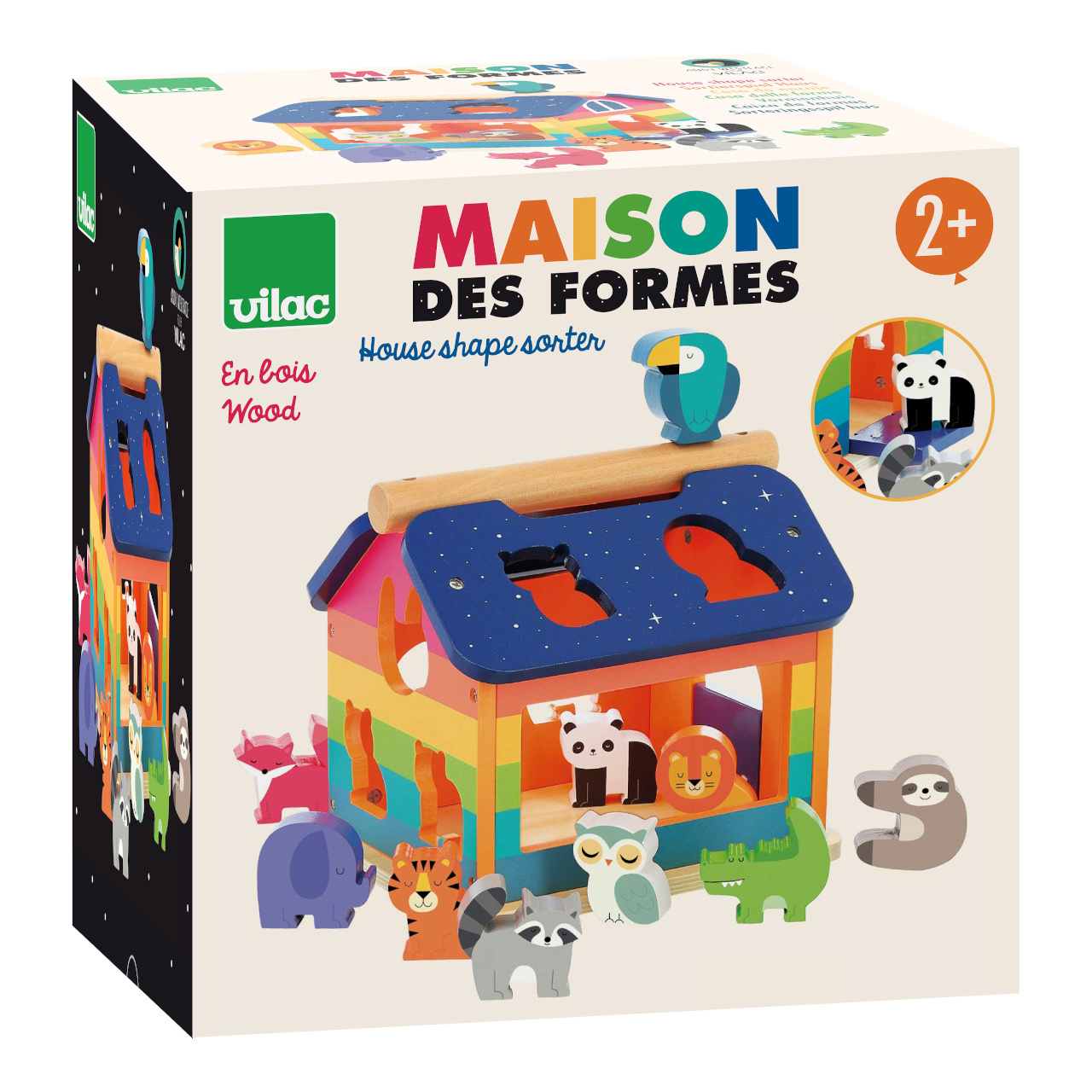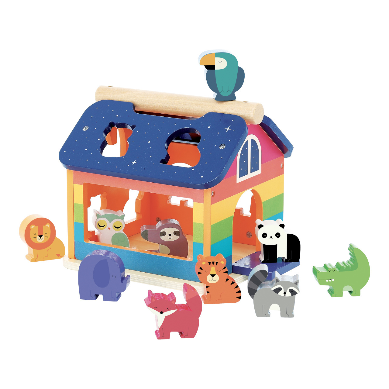 Tříděním a přemisťováním zvířátek se děti zábavně učí rozeznávat tvary, a lze je tak po krůčcích vést k samostatné hře v souladu s výukovými metodami Montessori. Rozmanité pestrobarevné figurky mohou správným pojmenováváním a přiřazováním charakteristických vlastností pomoci s rozvojem poznávacích dovedností a fantazie. Domeček je vybaven otevíratelnými dvířky, které jsou pružně zavěšeny tak, aby dětským prstíkům nehrozilo skřípnutí. Praktické madlo na střeše umožňuje snadnou manipulaci a přenášení. Hračka kombinuje robustní díly z masivního dřeva a odolné překližky, které zaručují vysokou životnost.