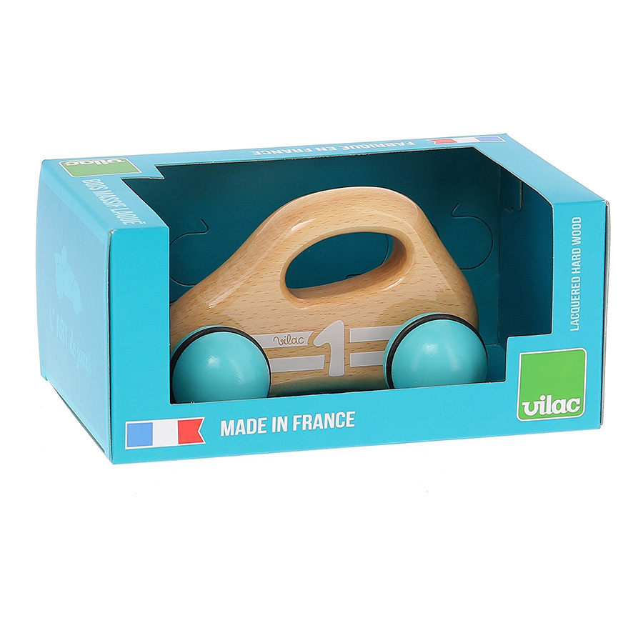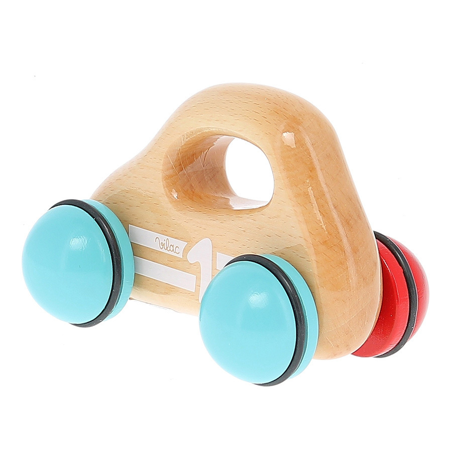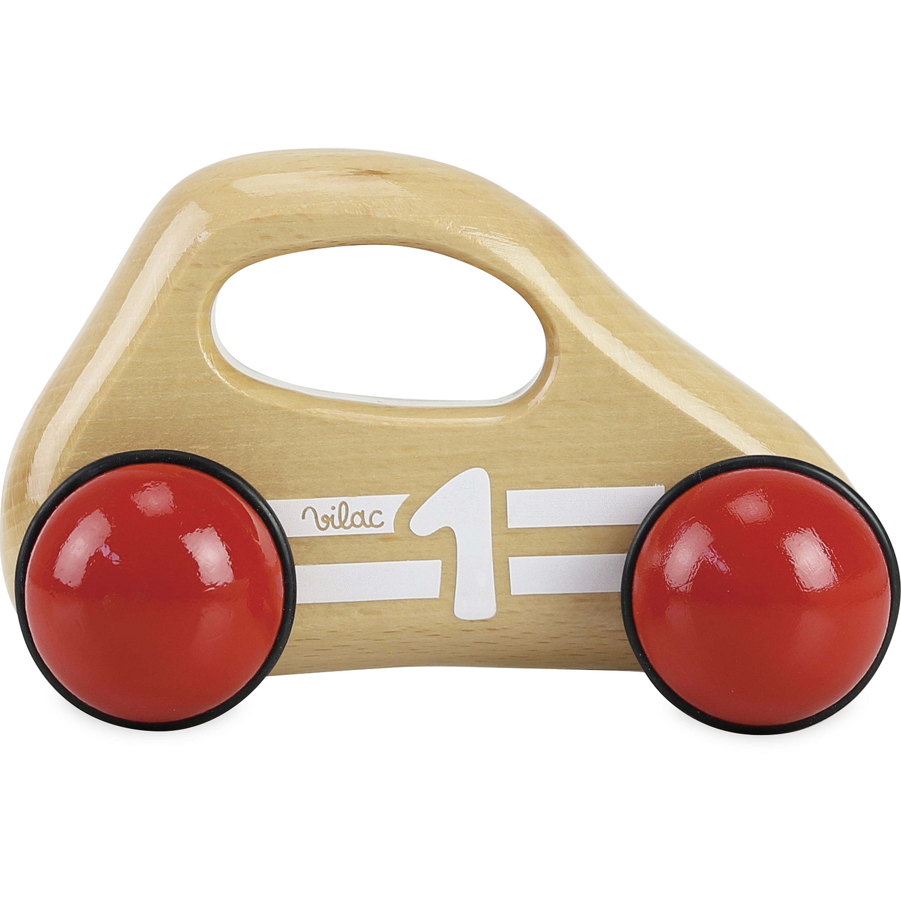 Závodní auto speciálního dizajnu, vyrobeno z přírodního lakovaného dřeva s dvojbarevnými pogumovanými koly. Je vhodné jak ke hraní tak jako dekorace do pokojů dětí či dospělých. Vyrobeno ve Francii.