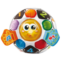 Barevný interaktivní míč podporuje přirozenou radost z pohybu, rozvoj smyslového vnímání a aktivně rozvíjí hrubou i jemnou motoriku dětí. Lze s ním házet, kutálet, ale může se do něj i kopat. Díky zabudovanému pohybovému čidlu míč na každý pohyb zareaguje roztomilými frázemi. Zároveň učí děti poznávat například čísla, barvy či protiklady, pomáhá rozvíjet slovní zásobu a dokáže zazpívat 3 písničky a přehrát až 15 známých melodií. Po vyjmutí ovládacího modulu lze míč vyprat. Hlasitost je možné nastavovat na ovládacím modulu, zvuky lze kromě pohybového čidla přehrávat i stisknutím tlačítka ve tvaru obličeje. Průměr míče je asi 17 cm, součástí balení jsou i 2 baterie 1,5 V AAA. MENUG s.r.o., Hodějovická 2458, 393 01 Pelhřimov, vtech@vtechcz.cz
