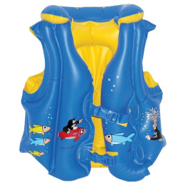 Dětská plavací vesta s motivy Krtečka a jeho kamarádů je skladná, bezpečná, snadno se nafukuje a vyfukuje. Je bez ftalátů a s bezpečnostními ventily. Děti mohou využít vestičku buď ke hře ve vodě nebo k výuce plavání. Vesta má nafukovací límce a nastavitelné přezky.