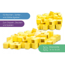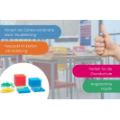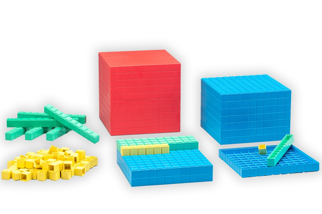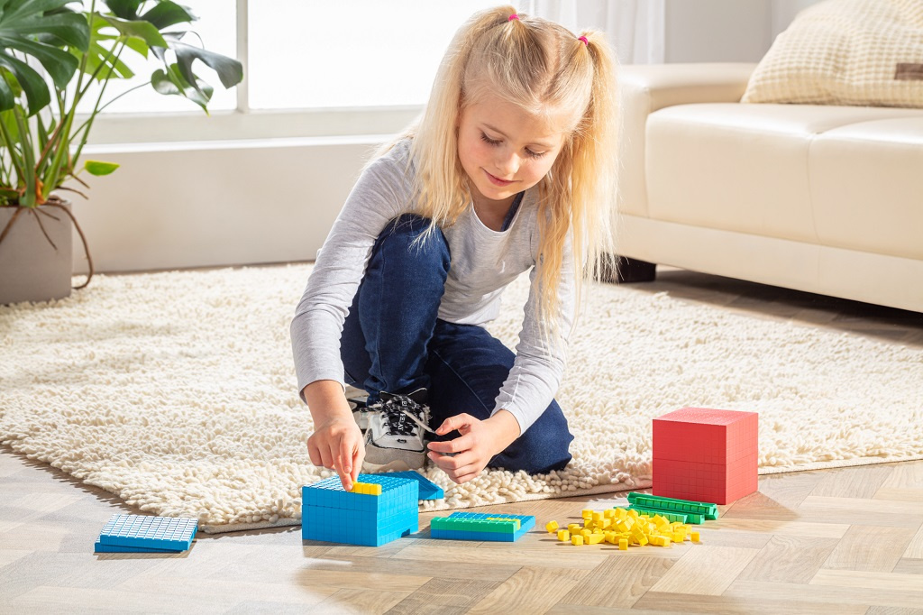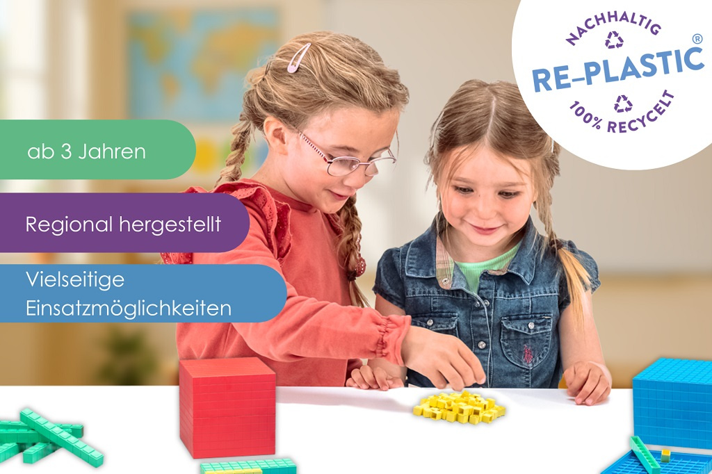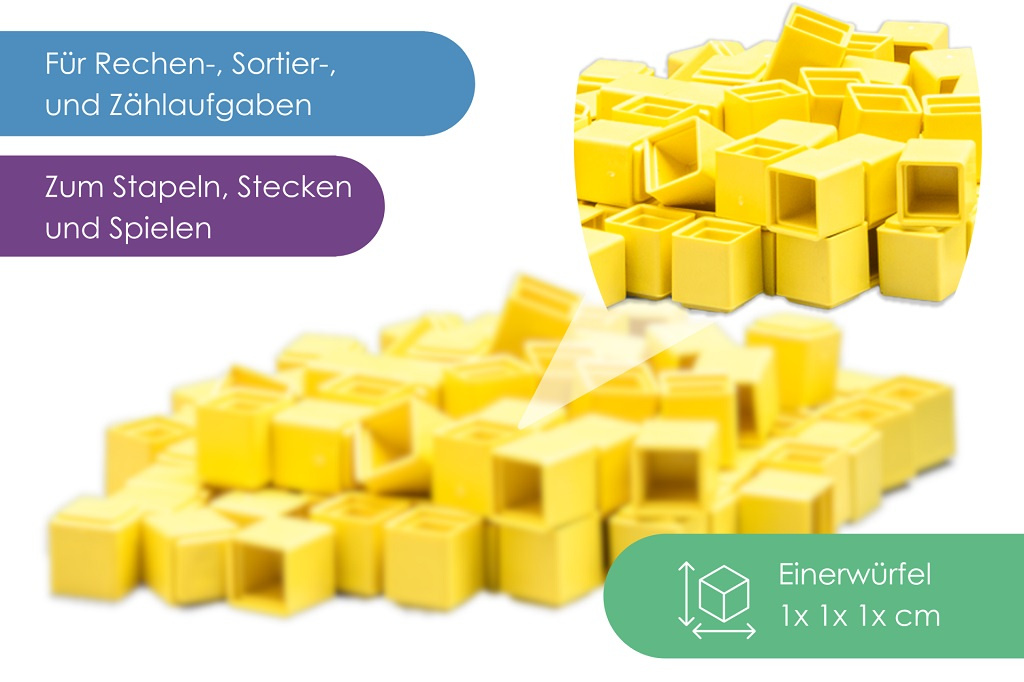 Tato sada se 121 dílky vyrobenými z udržitelného RE-plastu pomáhá dětem od 6 let hravou formou porozumět číslům. Podporuje rozpoznávání struktur a sebevědomé používání číselných hodnot, zejména při učení matematiky. Ideální pro základní školy k posílení aritmetických dovedností, jako je porovnávání objemů. Nepostradatelná aritmetická pomůcka pro každého, kdo si chce zlepšit své matematické dovednosti. Sada obsahuje 100 žlutých krychlí jednotek, 10 zelených tyčinek desítek, 10 modrých čtverců stovek a 1 červenou krychli tisícovku, která není skládací ale pevná.