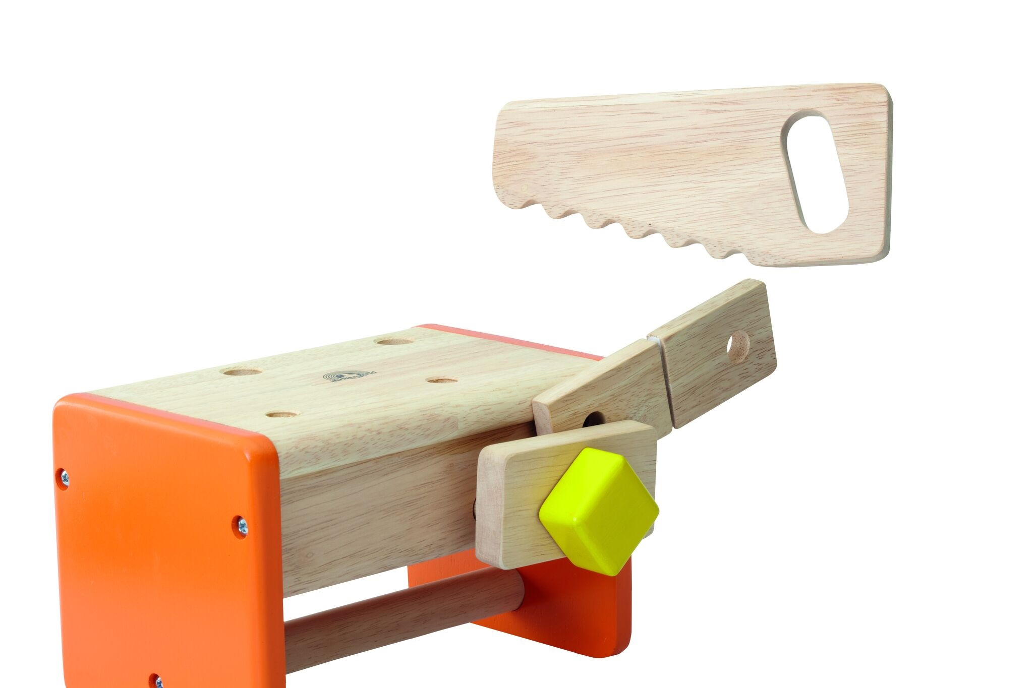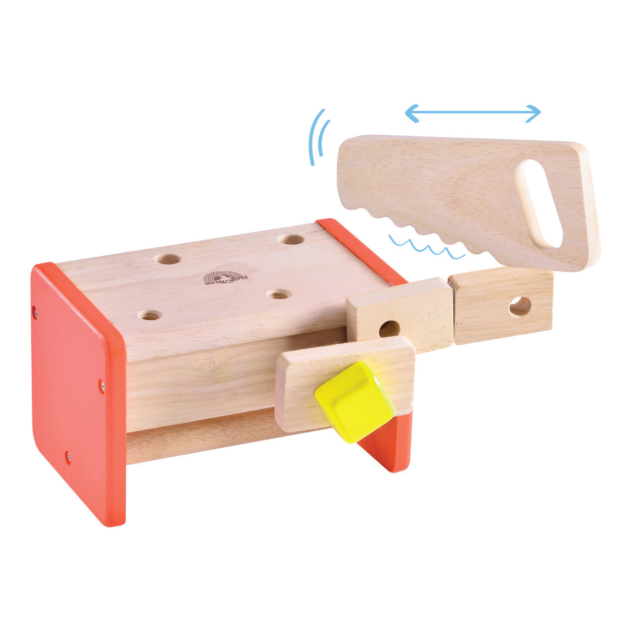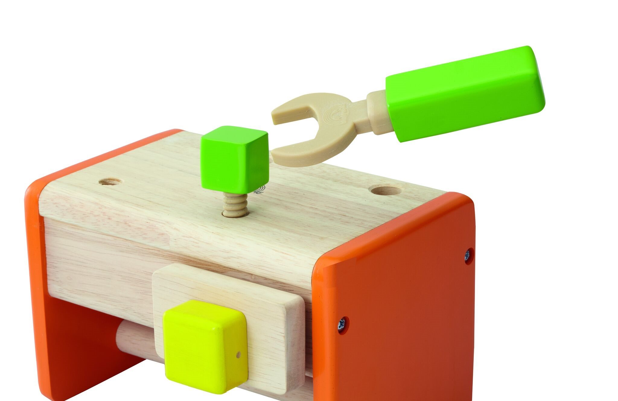 Podpořte v rozvoji svého malého domácího kutila pomocí promyšlené soupravy nářadí. Nářadí je dodáváno v praktické bedýnce s madlem, která se po otočení promění na dílenský stůl vybavený svěrákem. Děti se s pomocí této hračky mohou naučit základním manuálním dovednostem, použití klíče, kladívka nebo páky. Díky promyšlenému návrhu se také naučí třídit věci dle účelu a Vy díky němu ušetříte místo. Hračka je vyrobena z detailně opracovaného, odolného masivního dřeva a dřevoplastu, přitom atraktivně spojuje přírodní a syté barevné odstíny.