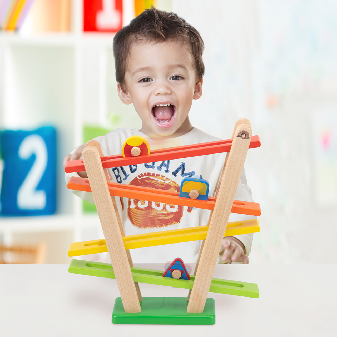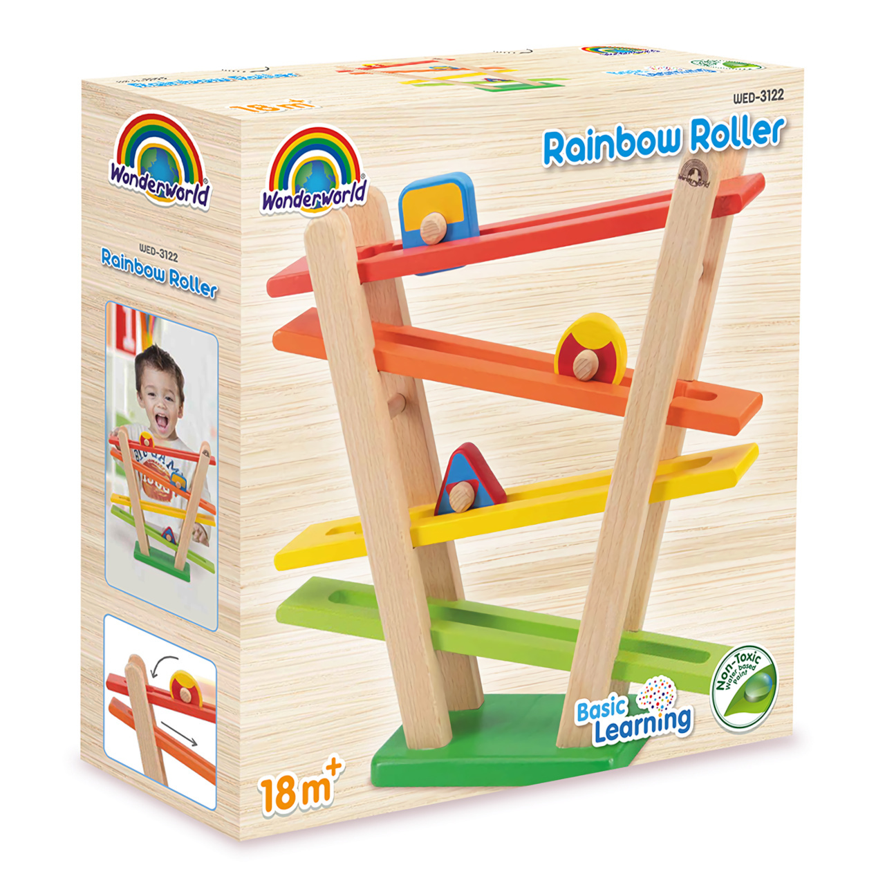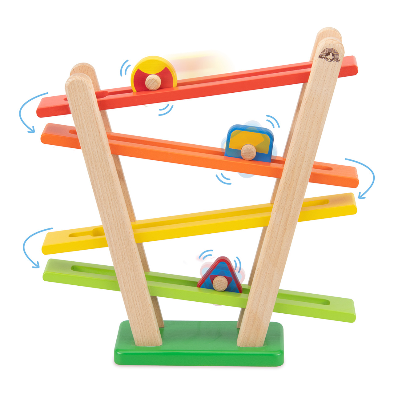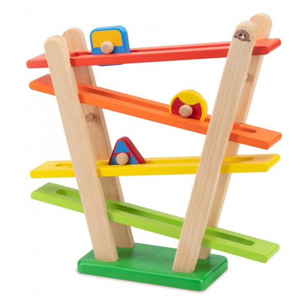 Tato dráha v barvách duhy jistě potěší každé dítě! Postavte na dráhu čtverec, trojúhelník nebo kolečko a sledujte, jak se kutálejí dolů po dráze a jak se při jejich rychlém pohybu vzory mihotají před očima.
