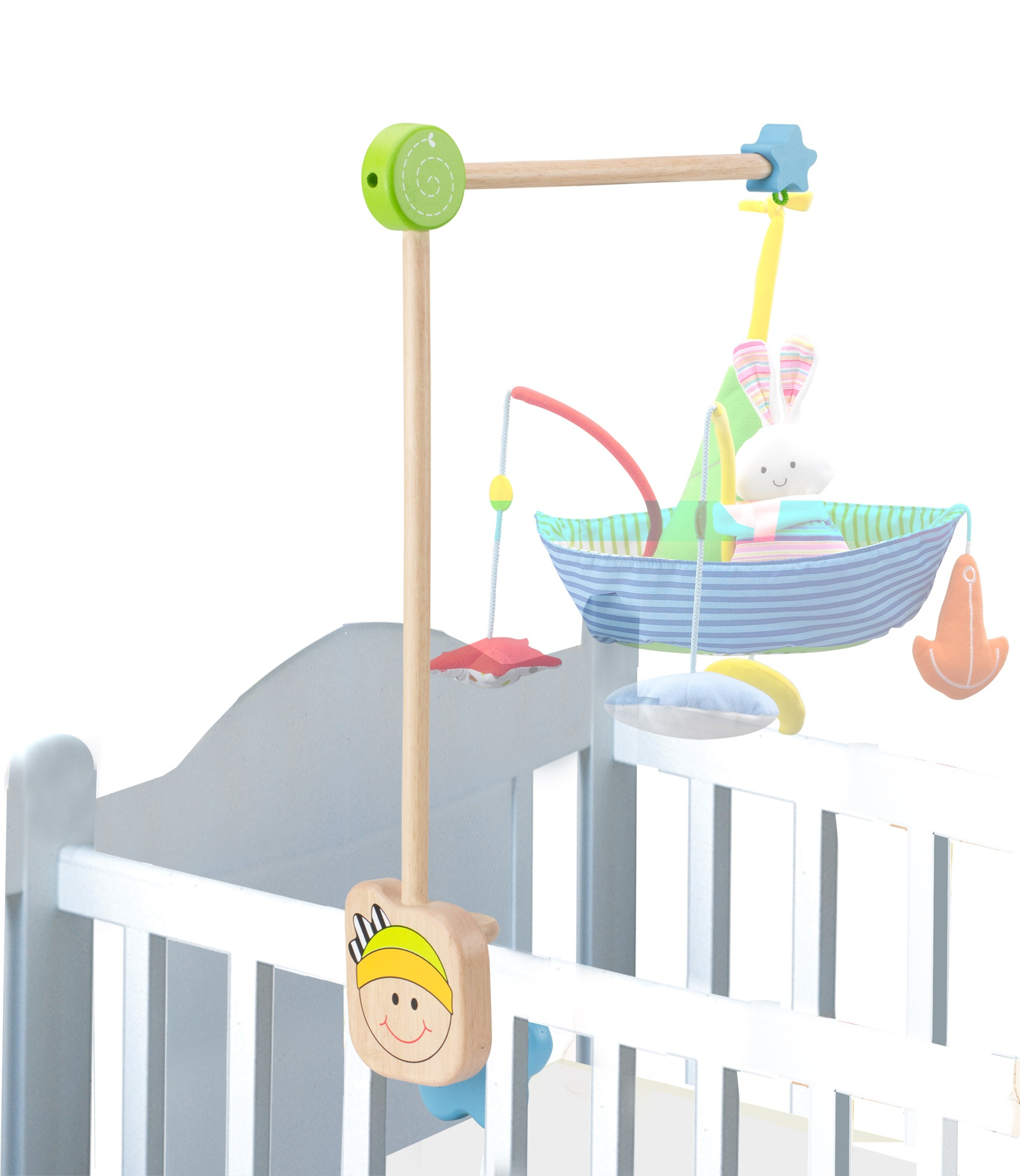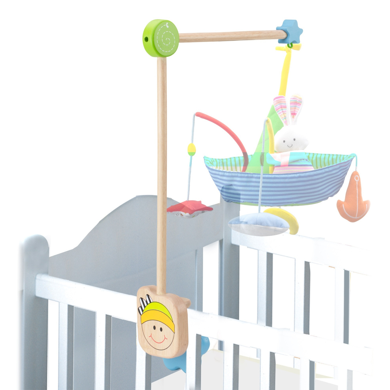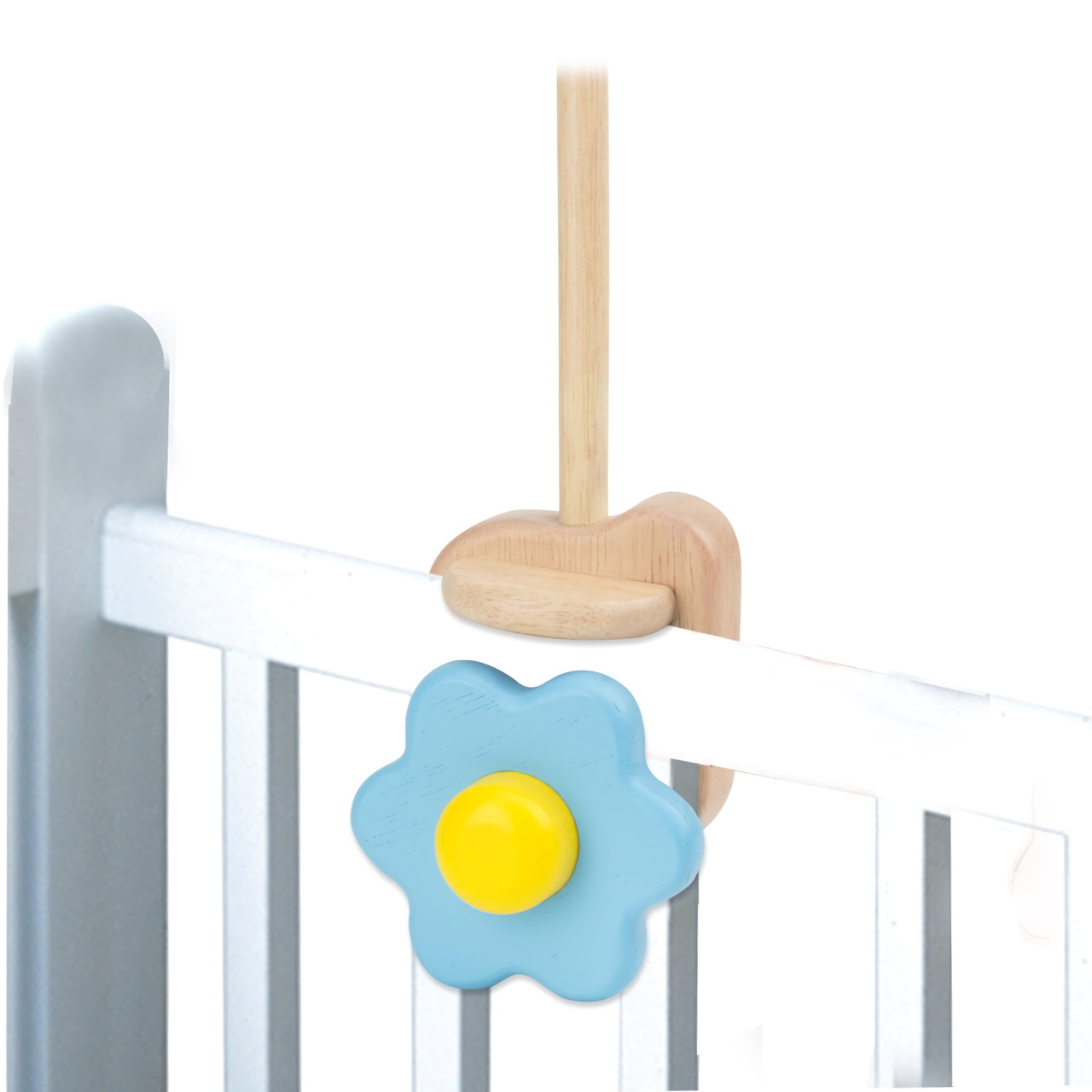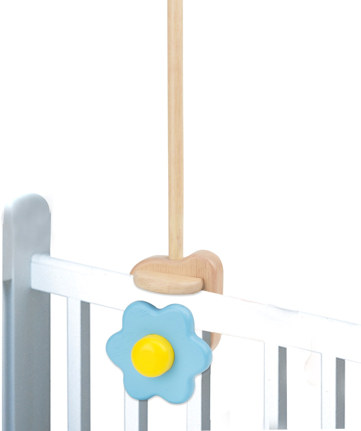 Dekorovaný dřevěný věšák pro dětský kolotoč je vyroben z masivního dřeva a je snadno sestavitelný, opatřený robustními závity. K zábradlí postýlky se upíná velkým praktickým kolečkem s motivem kytičky, díky kterému jej lze připojit pevně a v případě potřeby i snadno odejmout. Na svém konci je opatřen poutkem k zavěšení kolotoče.