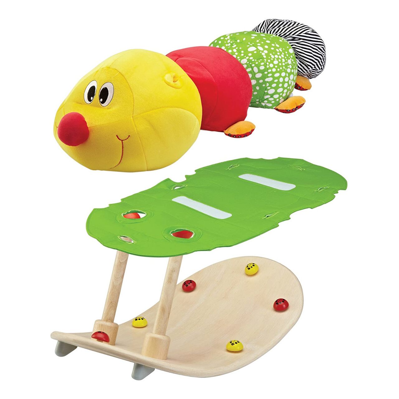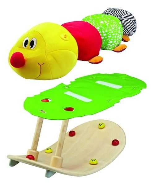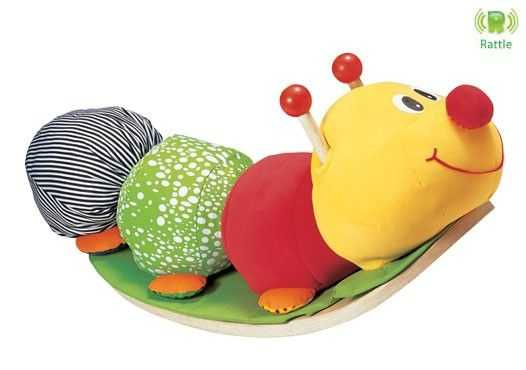 Měkká a pestrobarevná houpací hračka s přátelským charakterem, která přinese spousty zábavy. Dětem pomůže s rozvojem motoriky, rovnováhy, procvičením svalů rukou i nohou a zároveň poslouží jako krásná dekorace pokoje! Textilní část houpačky můžete oddělit, roztomilá housenka tedy může posloužit také jako velký plyšák. V nose housenky je vestavěné chrastítko s jemným zvukem. Základna houpačky je vyrobena z masivního dřeva a je opatřena dorazy zajišťujícími bezpečnost proti převrácení.